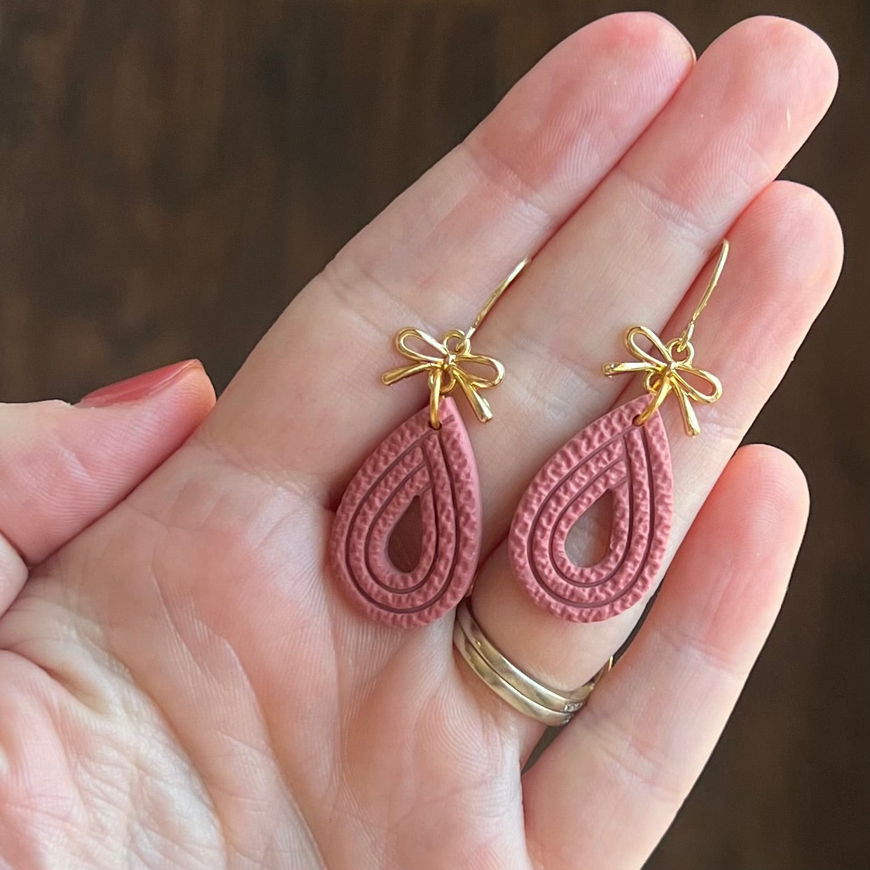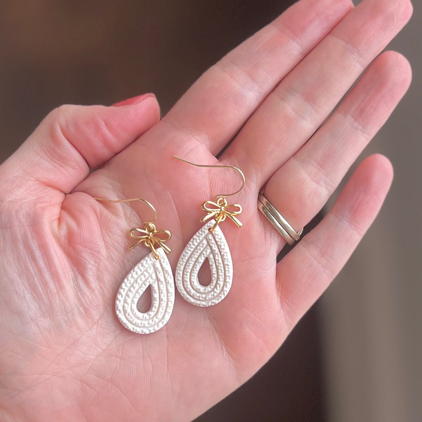 Textured, embossed piped teardrop with bow charm connector on gold plated hooks. 25% of all sales donated to rescuing women from sexual exploitation.