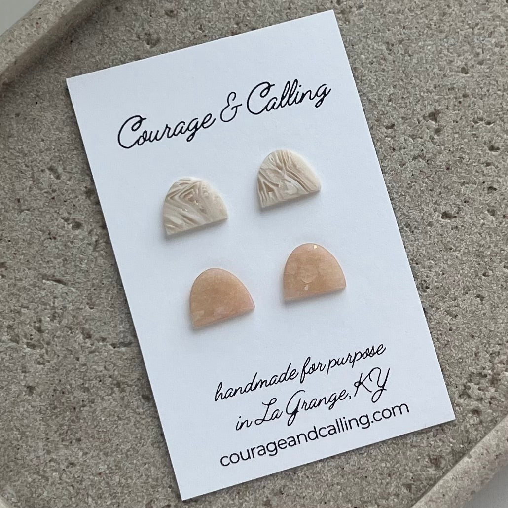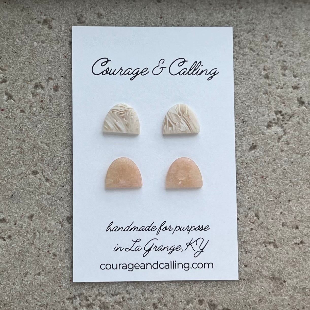 2 Pairs of Arch studs in Pristine Abalone and Pink Opaline polymer clay on 12k gold plated posts sealed with resin. Lightweight, durable polymer clay. 25% of all sales donated to rescuing women from sexual exploitation.