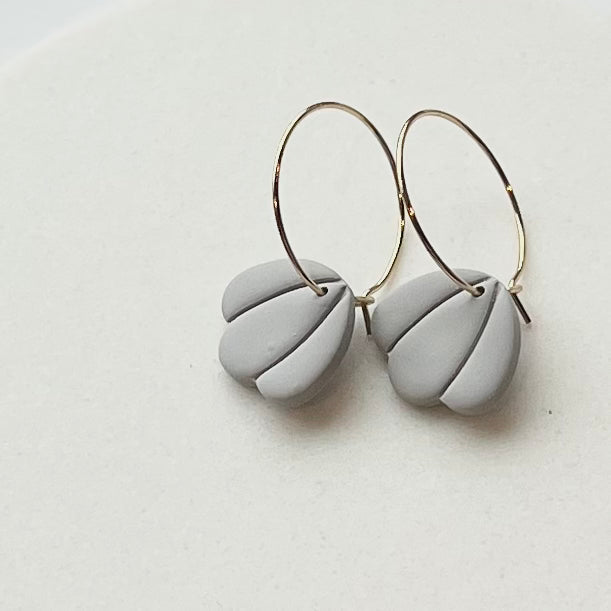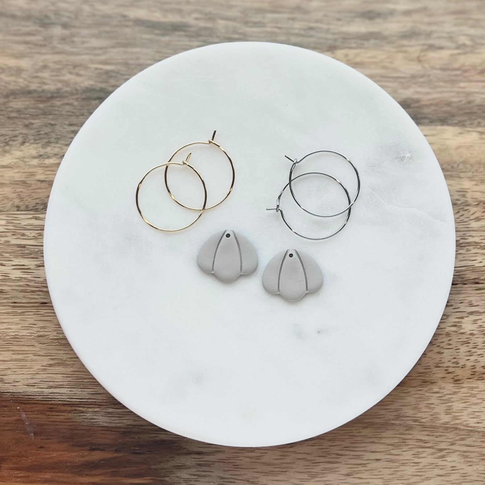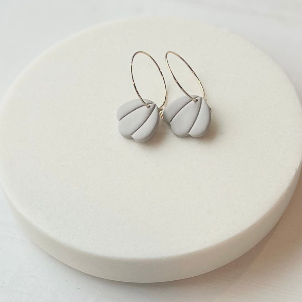 Aria embossed clay charm in griege polymer clay on 20mm silver or gold plated hoops. 25% of all sales donated to rescuing women from sexual exploitation.