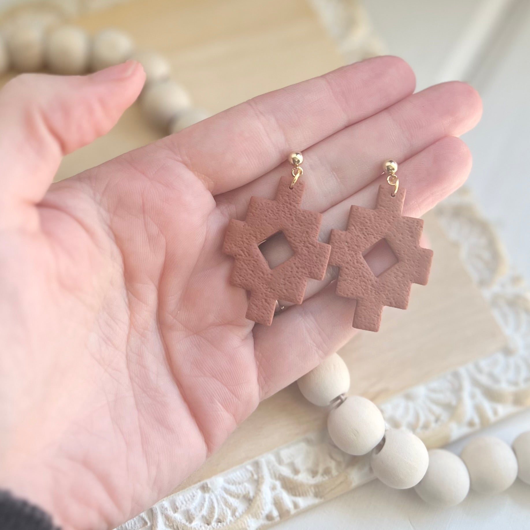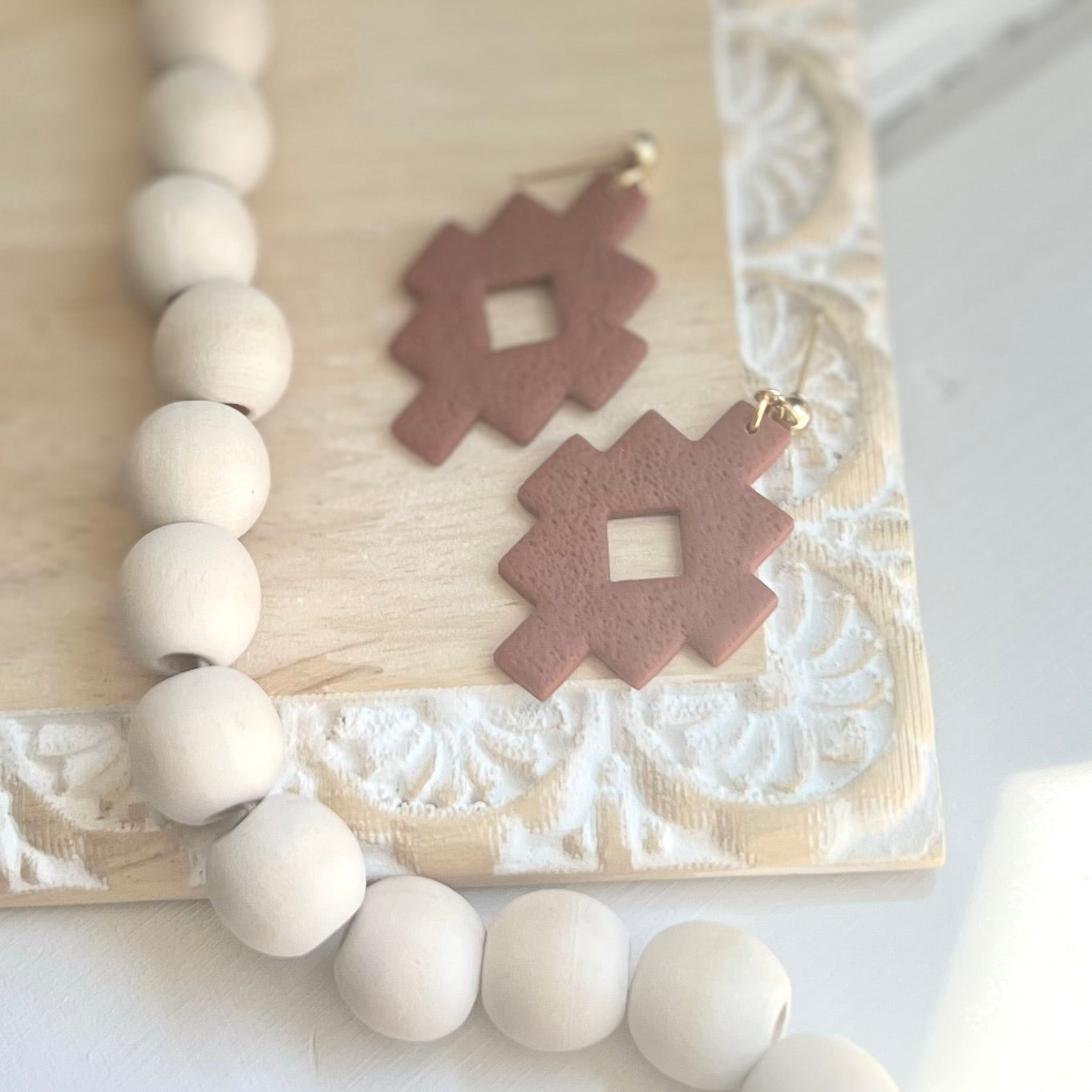 Tribal, Aztec shape dangles in textured dark Terra cotta color on 12k gold plated ball posts. 25% of all sales donated to rescuing women from sexual exploitation.
