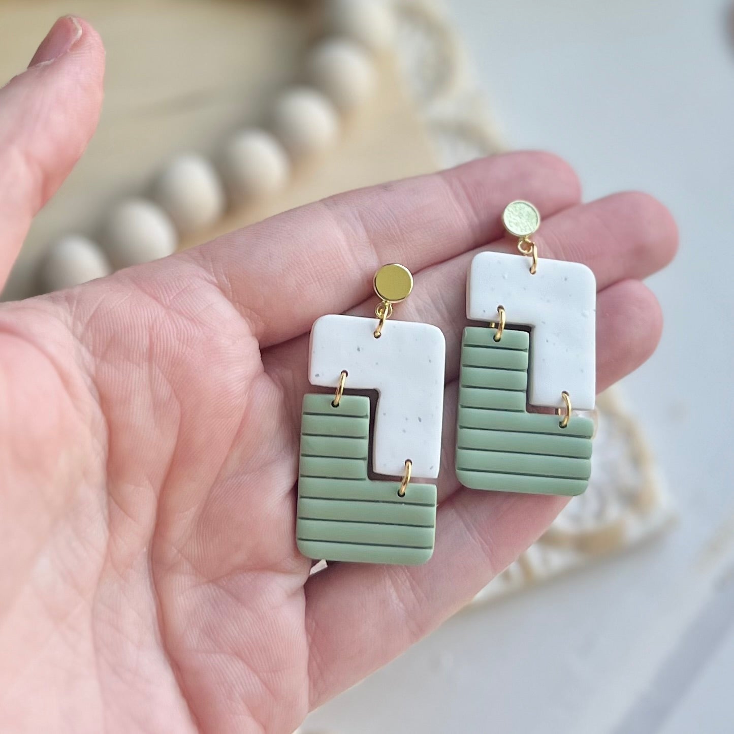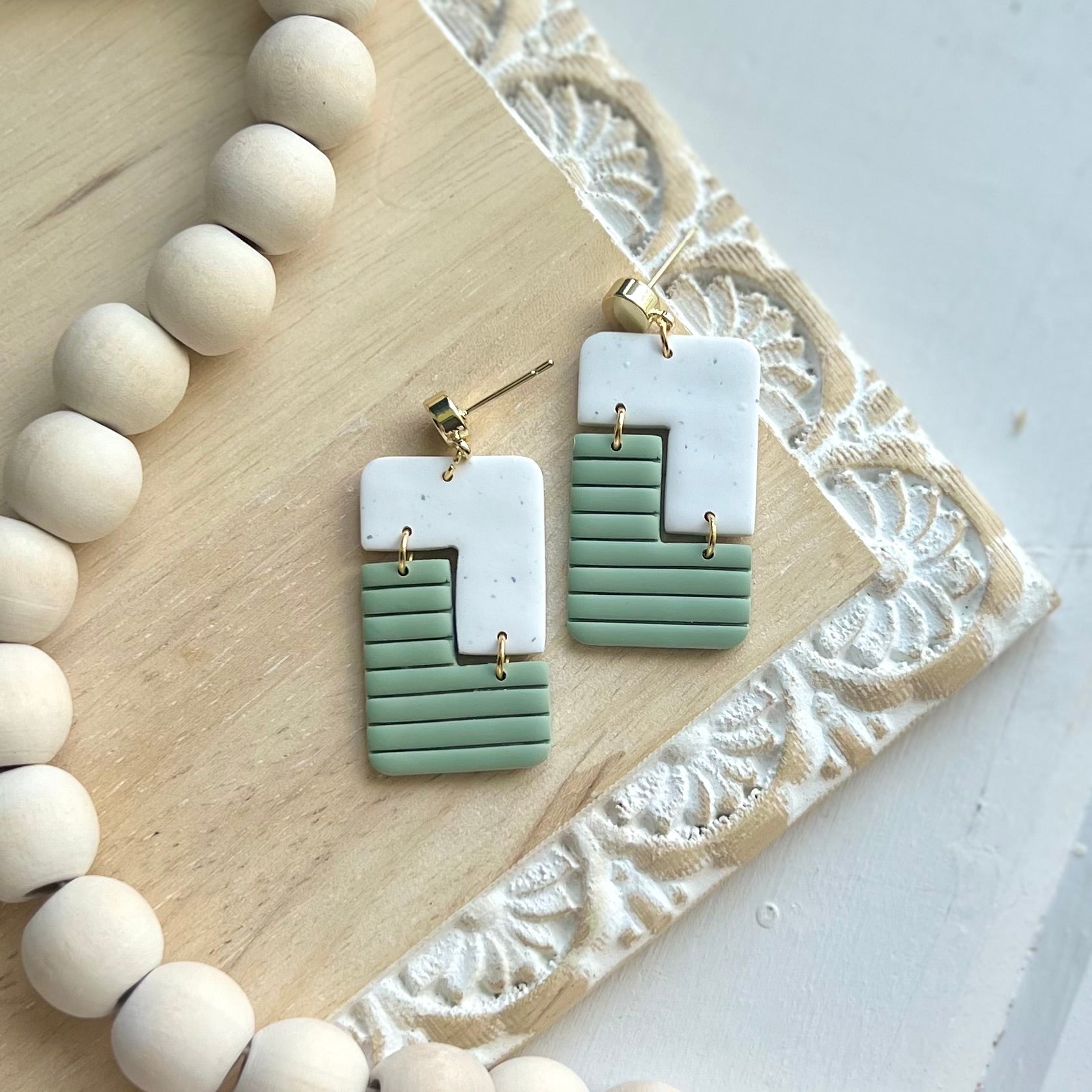 Riley clay dangles in eucalyptus and sand colors on 12k gold plated circle posts. 25% of all sales donated to rescuing women from sexual exploitation.