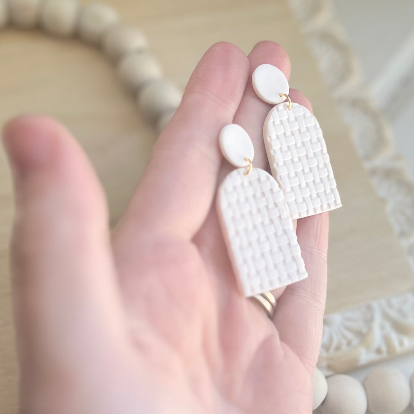 Our classic Emery Dangles with woven basket texture in almost pink clay color on 12k gold plated posts. 25% of all sales donated to rescuing women from sexual exploitation.