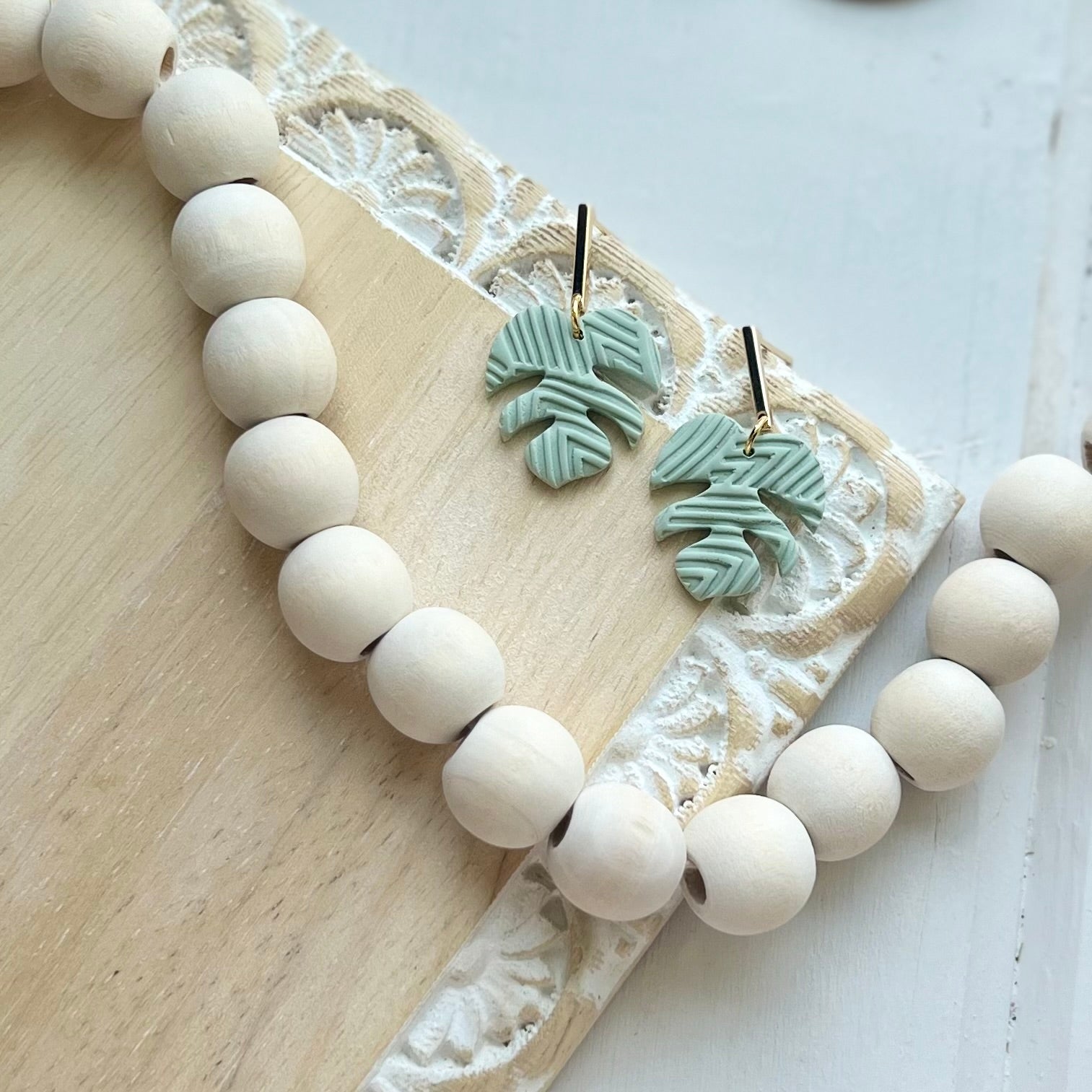 Tribal textured monstera leaves on gold plated bar finding. Lightweight, durable polymer clay. 25% of all sales donated to rescuing women from sexual exploitation.