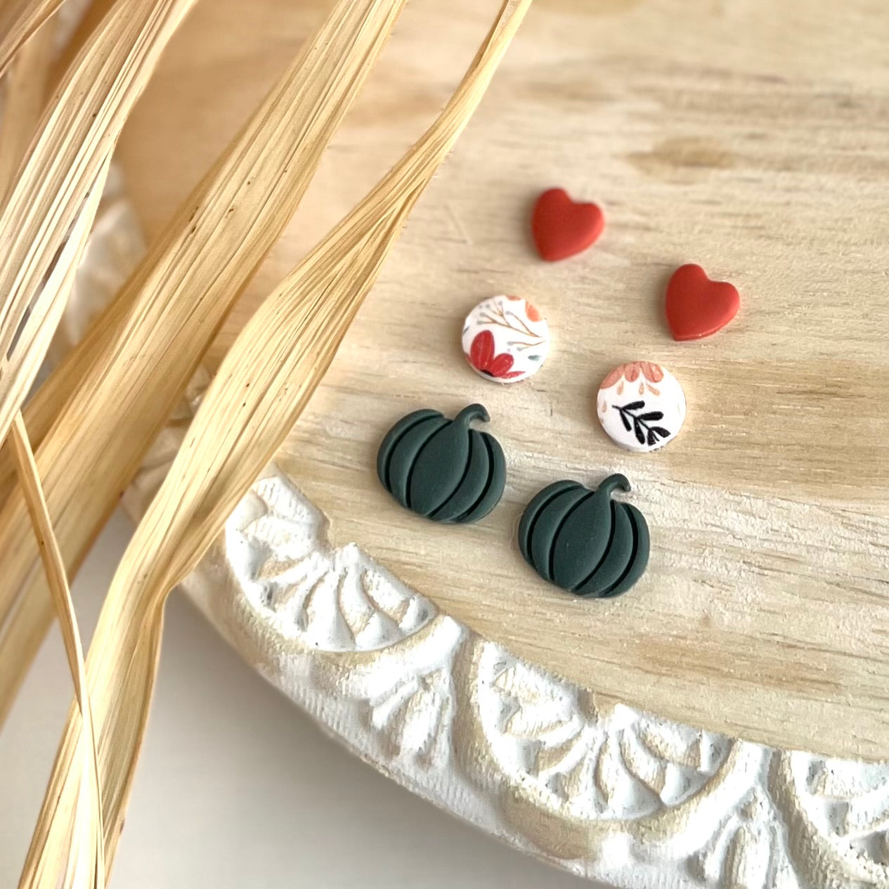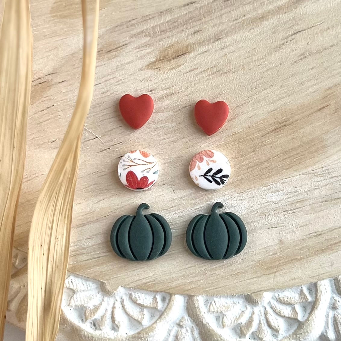 Mini saffron clay hearts, groovy fall print circles and dark sage embossed pumpkin clay studs on 12k gold plated posts sealed with resin. 25% of all sales donated to rescuing women from sexual exploitation.