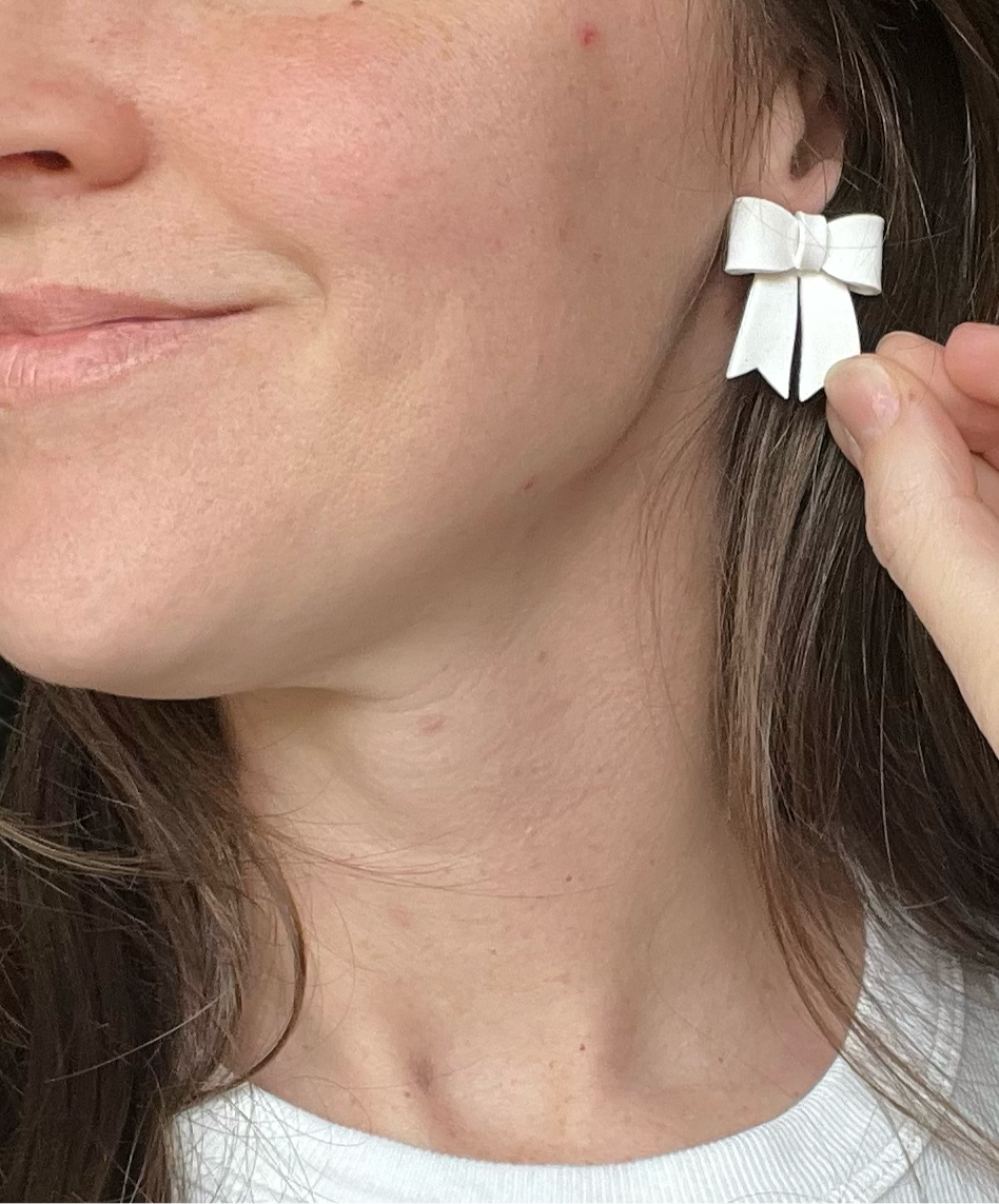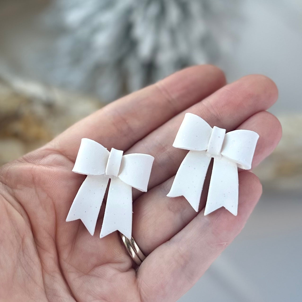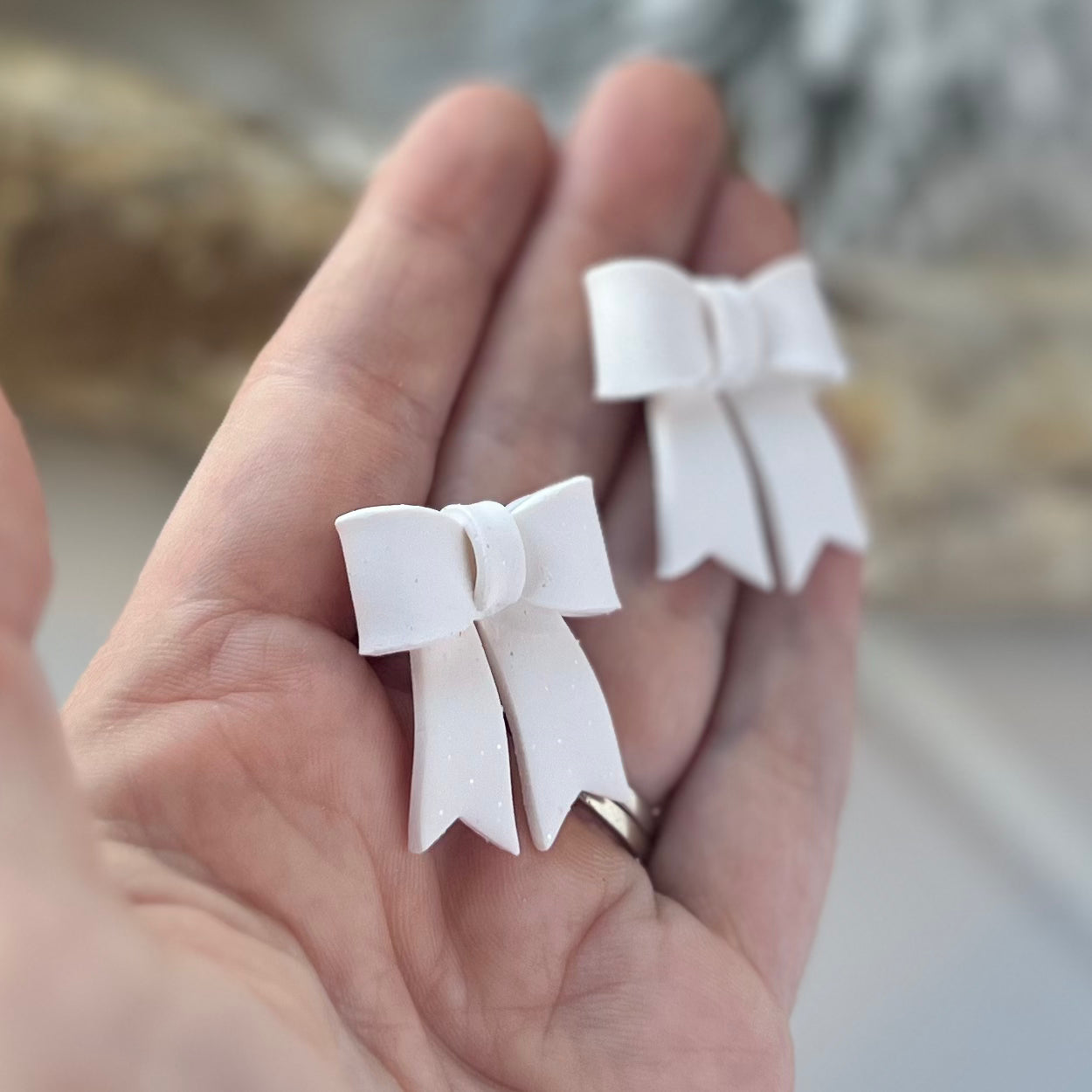 Statement 3D clay bows in glittery white polymer clay on 12k gold plated posts sealed with resin. 25% of all sales donated to rescuing women from sexual exploitation.