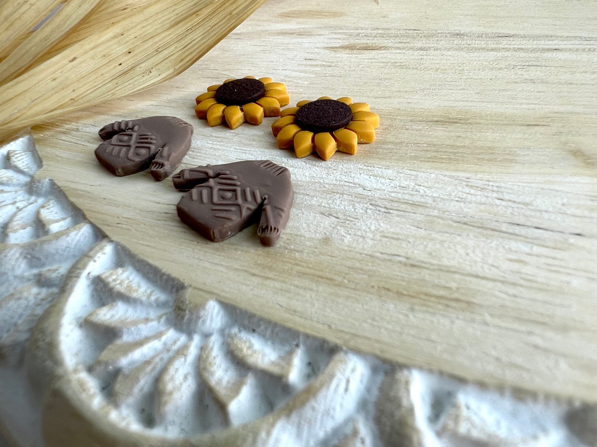 Sunflowers and boho textured greige sweater clay studs on 12k gold plated posts sealed with resin. 25% of all sales donated to rescuing women from sexual exploitation.