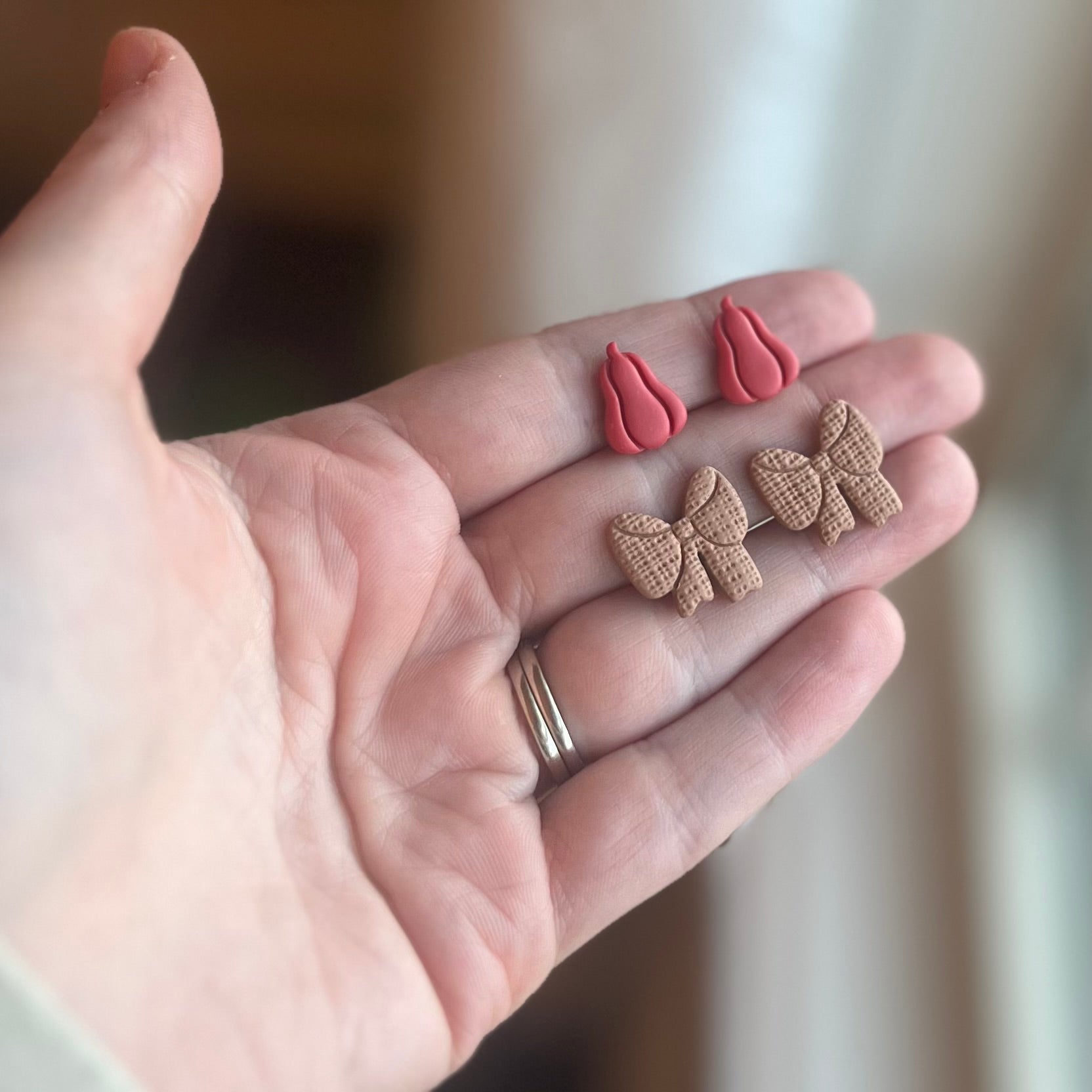 Saffron color embossed gourds and tan knit texture bow studs on 12k gold plated posts sealed with resin. 25% of all sales donated to rescuing women from sexual exploitation.
