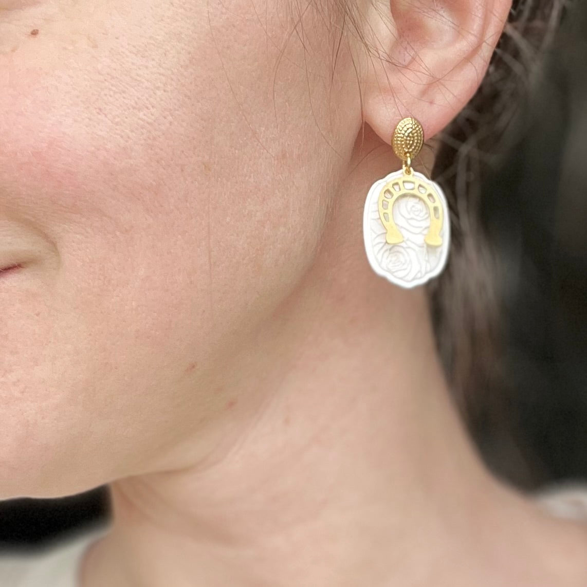 Textured white rose framed plaque with gold horseshoe charm on matching hammered oval finding. Lightweight, durable polymer clay. 25% of all sales donated to rescuing women from sexual exploitation.