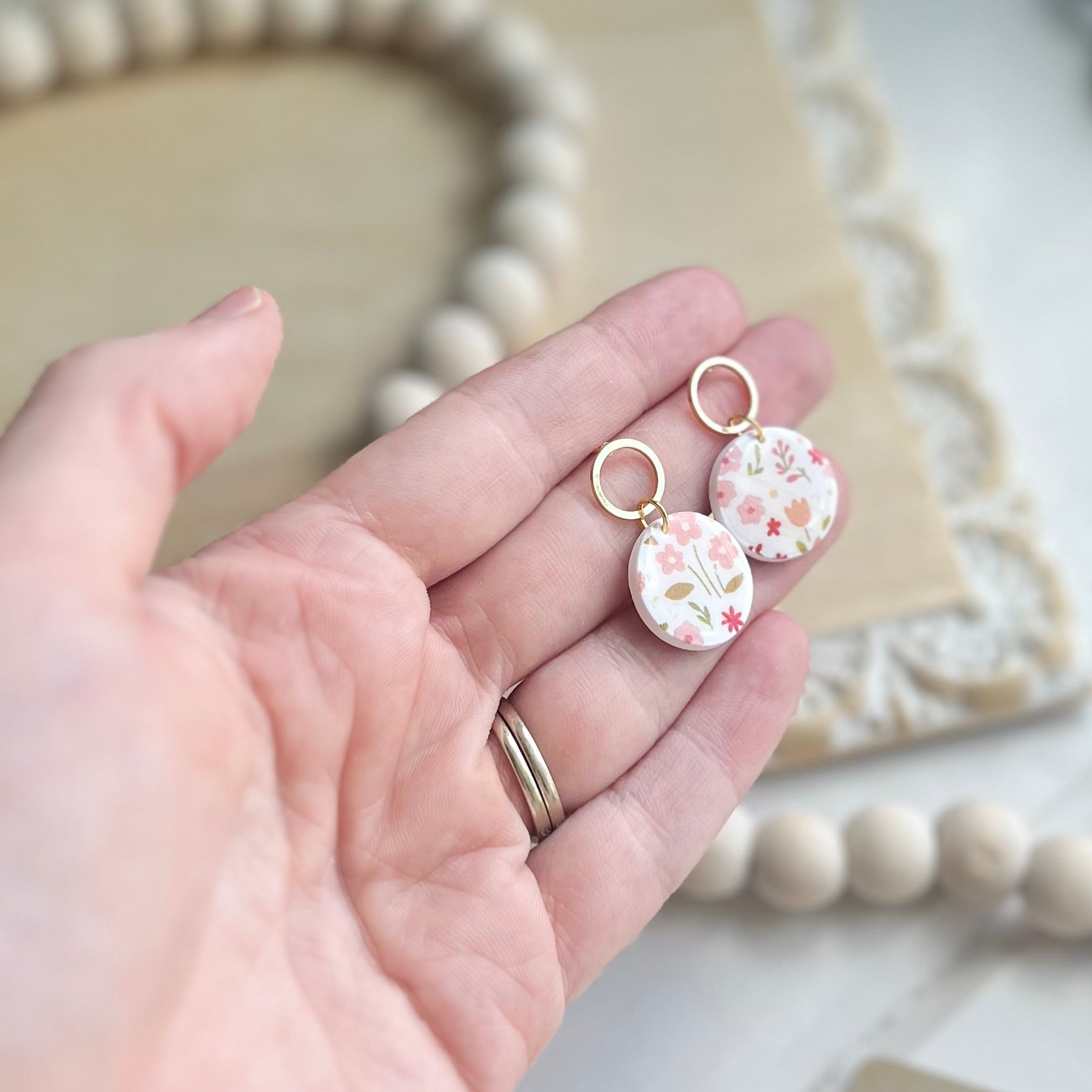 Petite gold plated circle findings with circle clay charm in summer print sealed with resin. Lightweight, durable polymer clay. 25% of all sales donated to rescuing women from sexual exploitation.