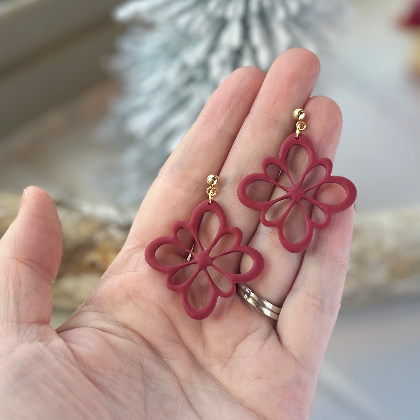Statement cutout clay earrings in vintage red on 12k gold plated ball posts. 25% of all sales donated to rescuing women from sexual exploitation.