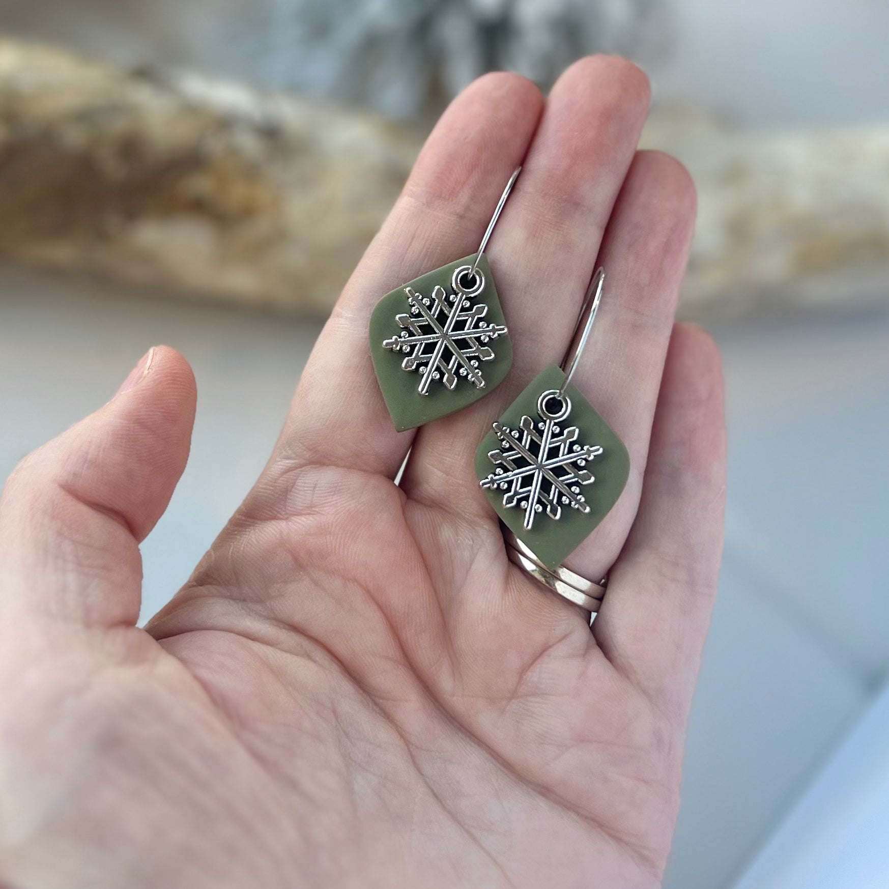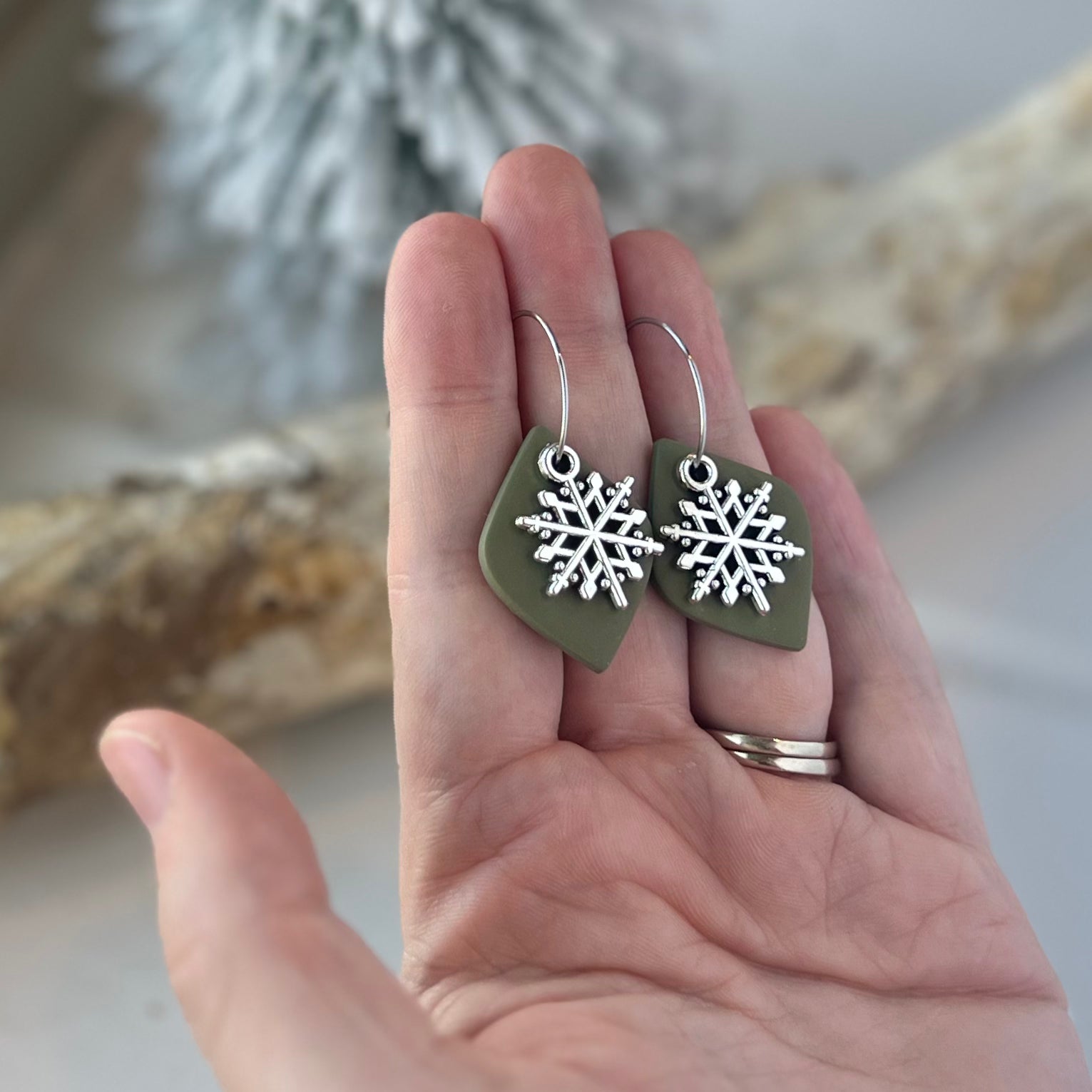 Antique effect snowflake charm and olive green clay charm on 20mm silver plated hoops. 25% of all sales donated to rescuing women from sexual exploitation.
