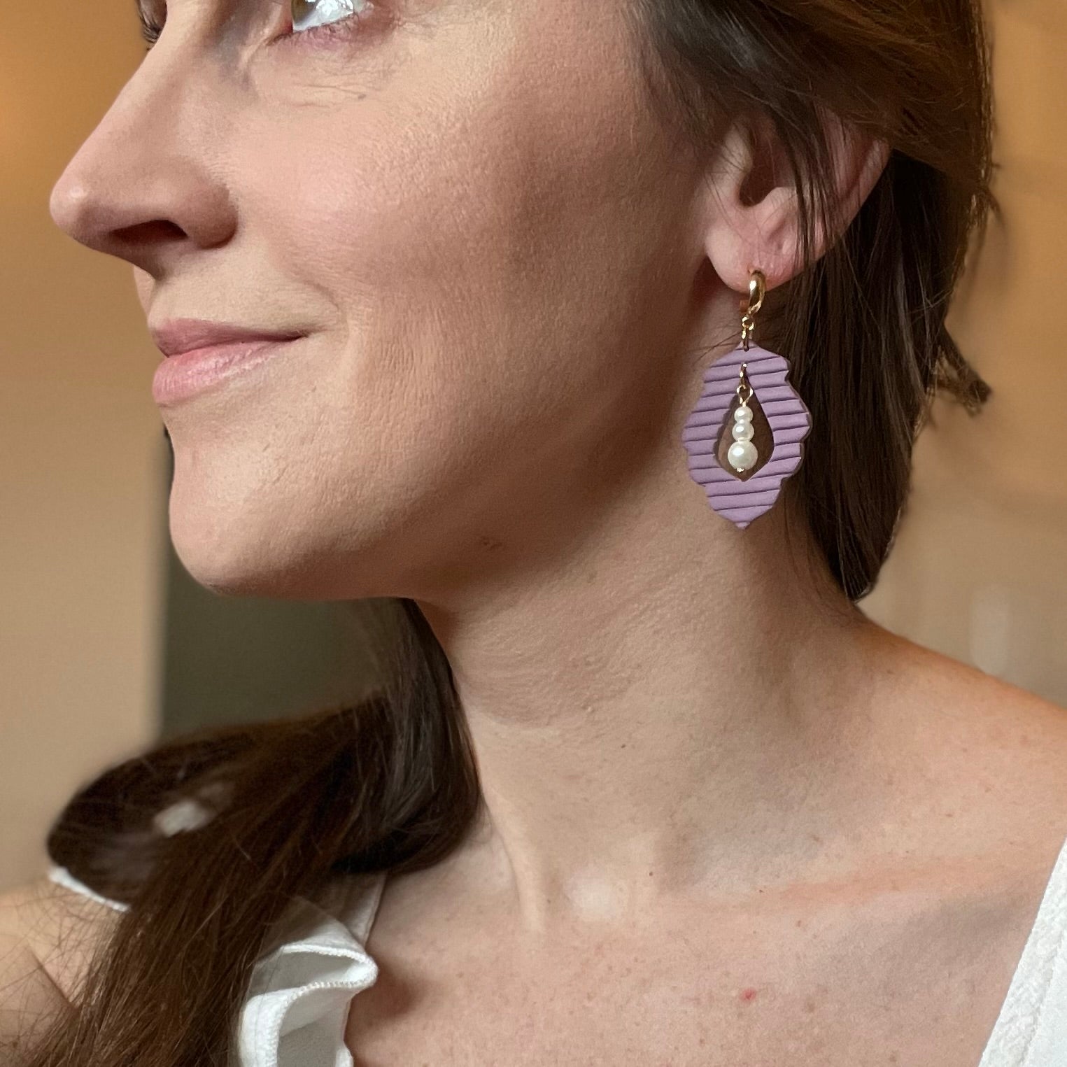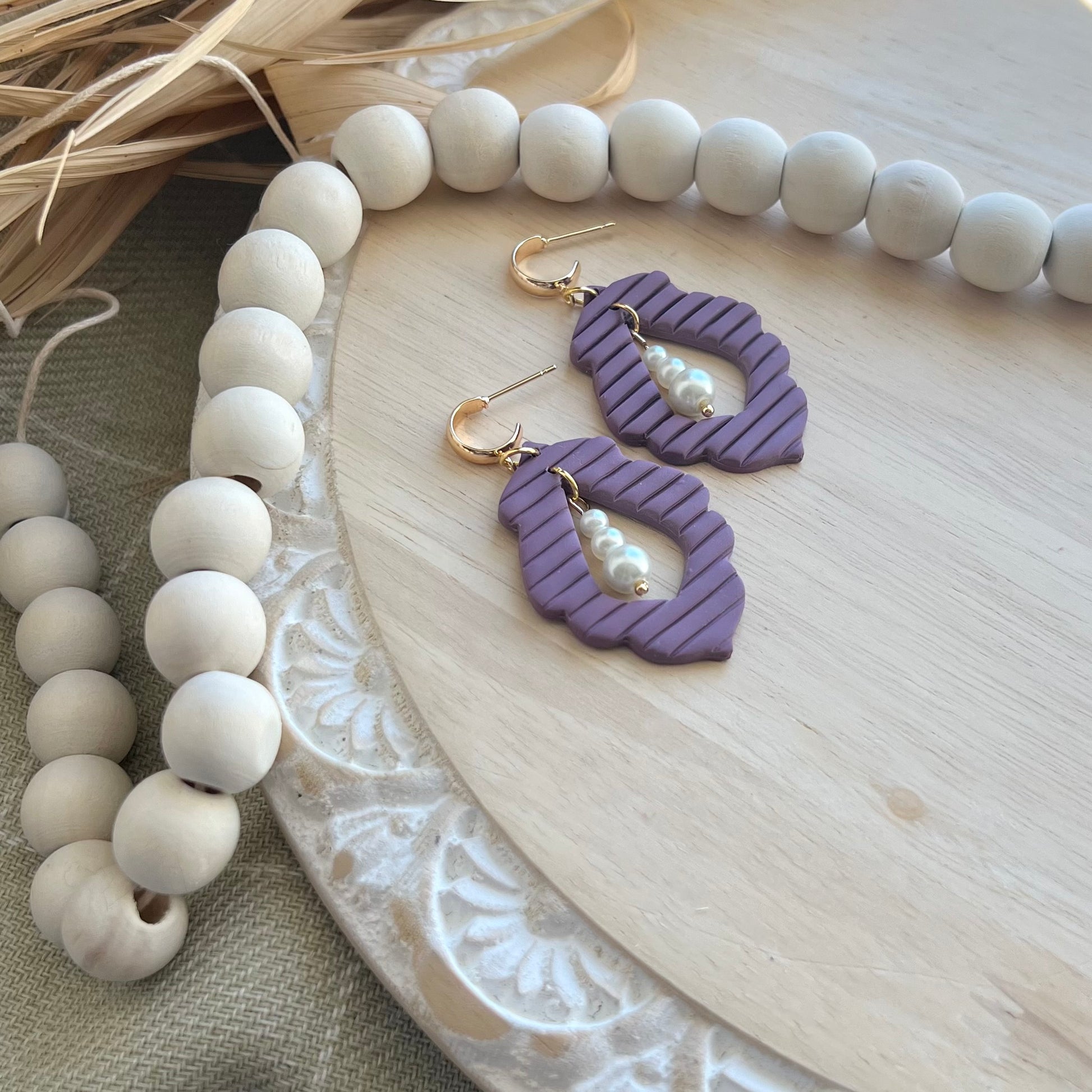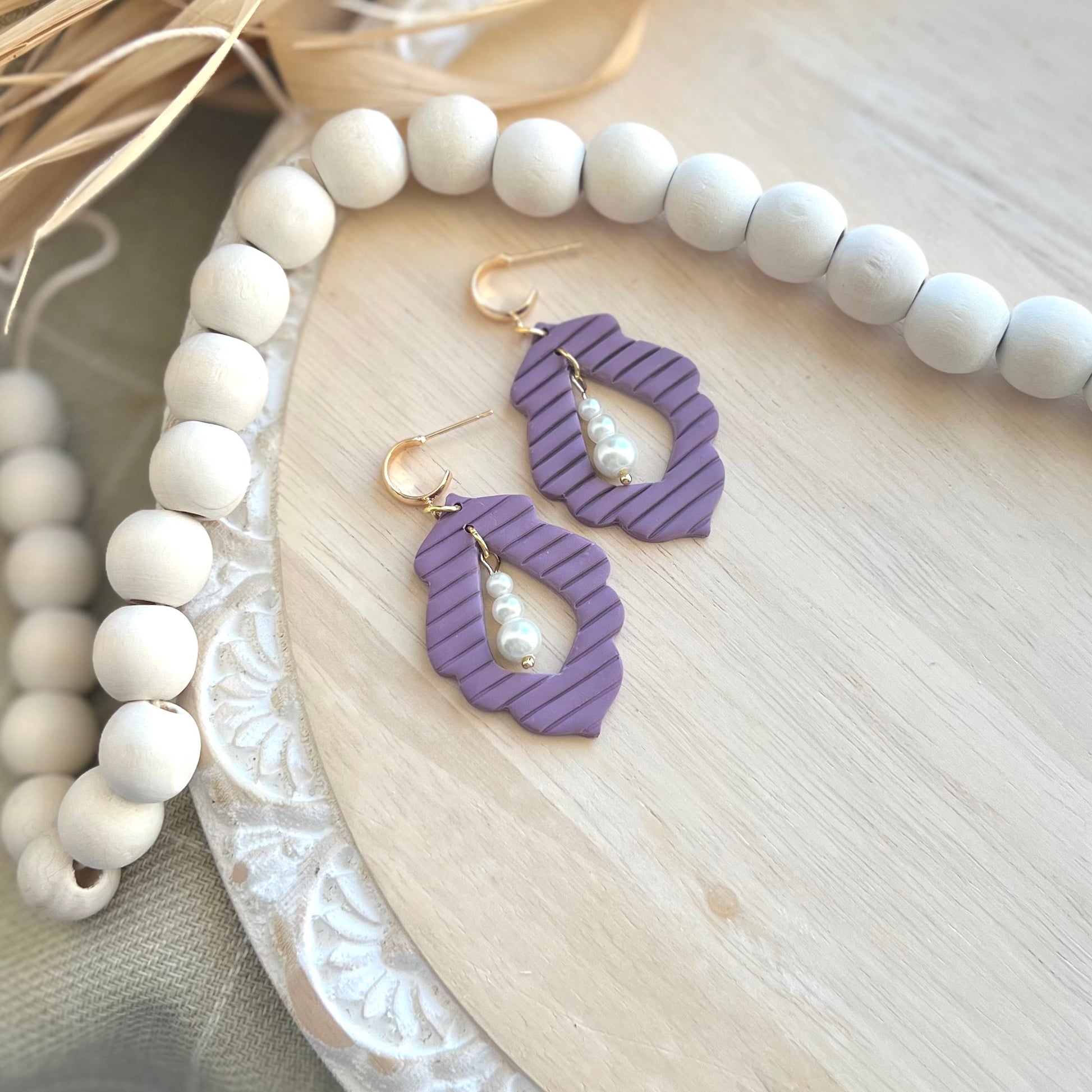 Striped Lavender Clay Dangle Earrings with pearl strand charm on a 12k gold plated mini hoop stud. Lightweight, durable polymer clay. 25% of all sales donated to rescuing women from sexual exploitation.