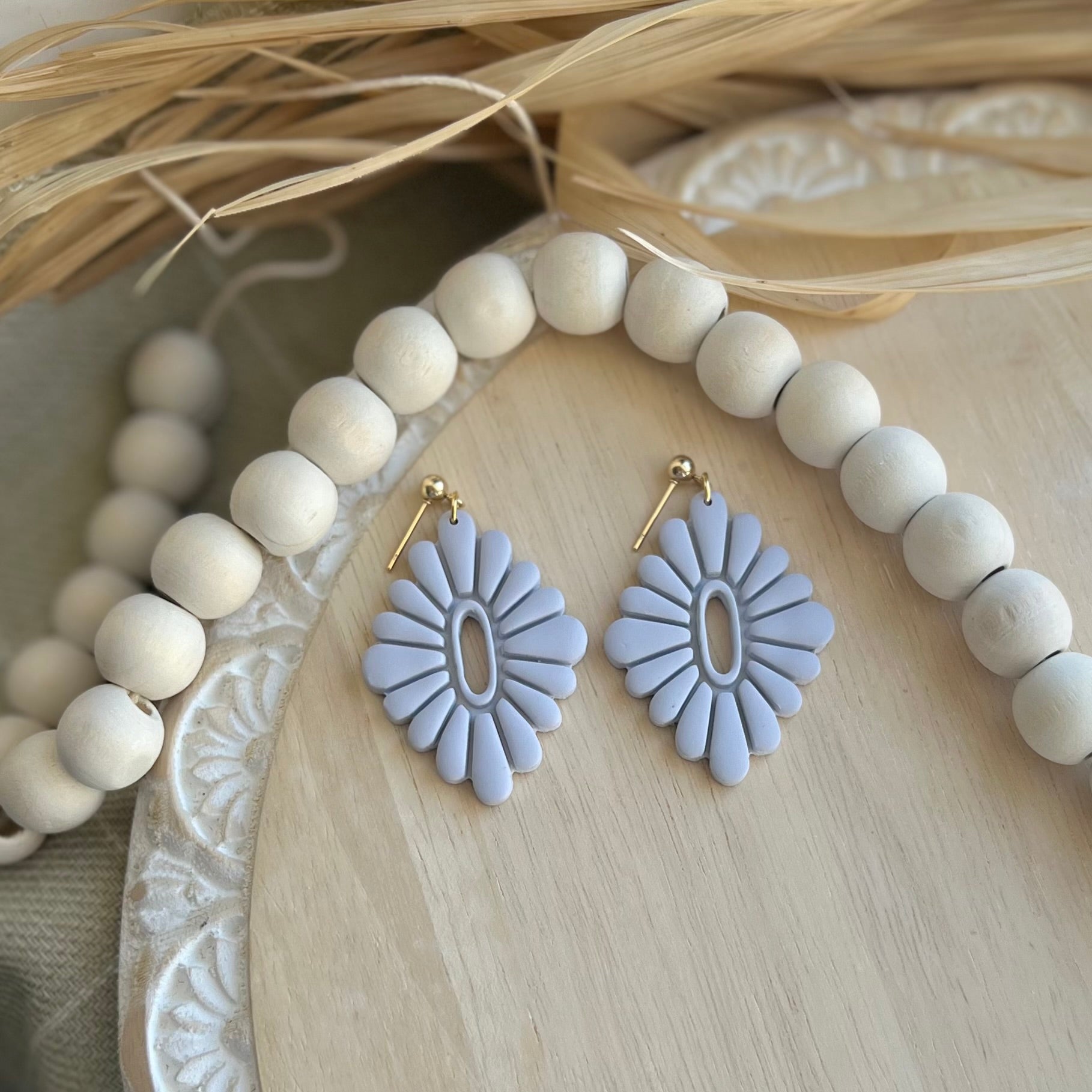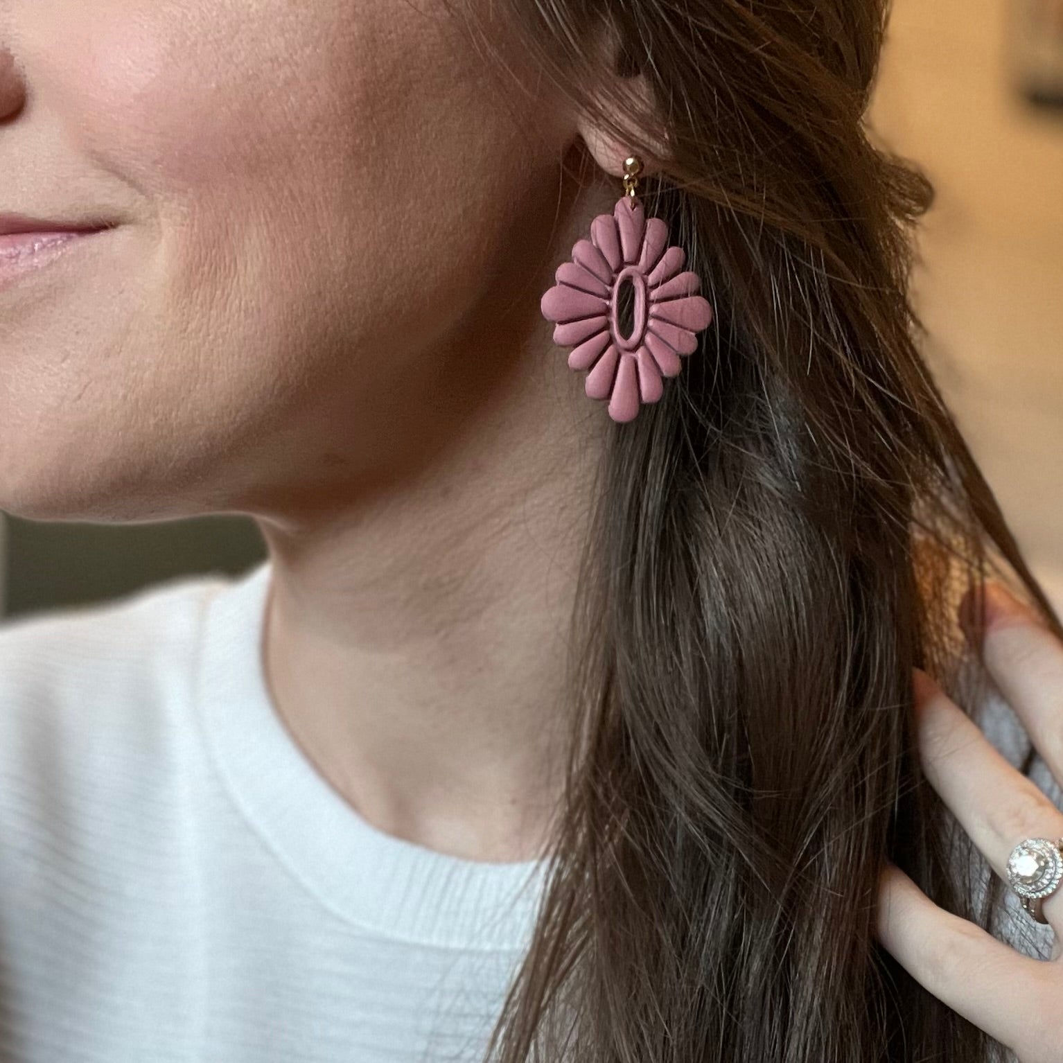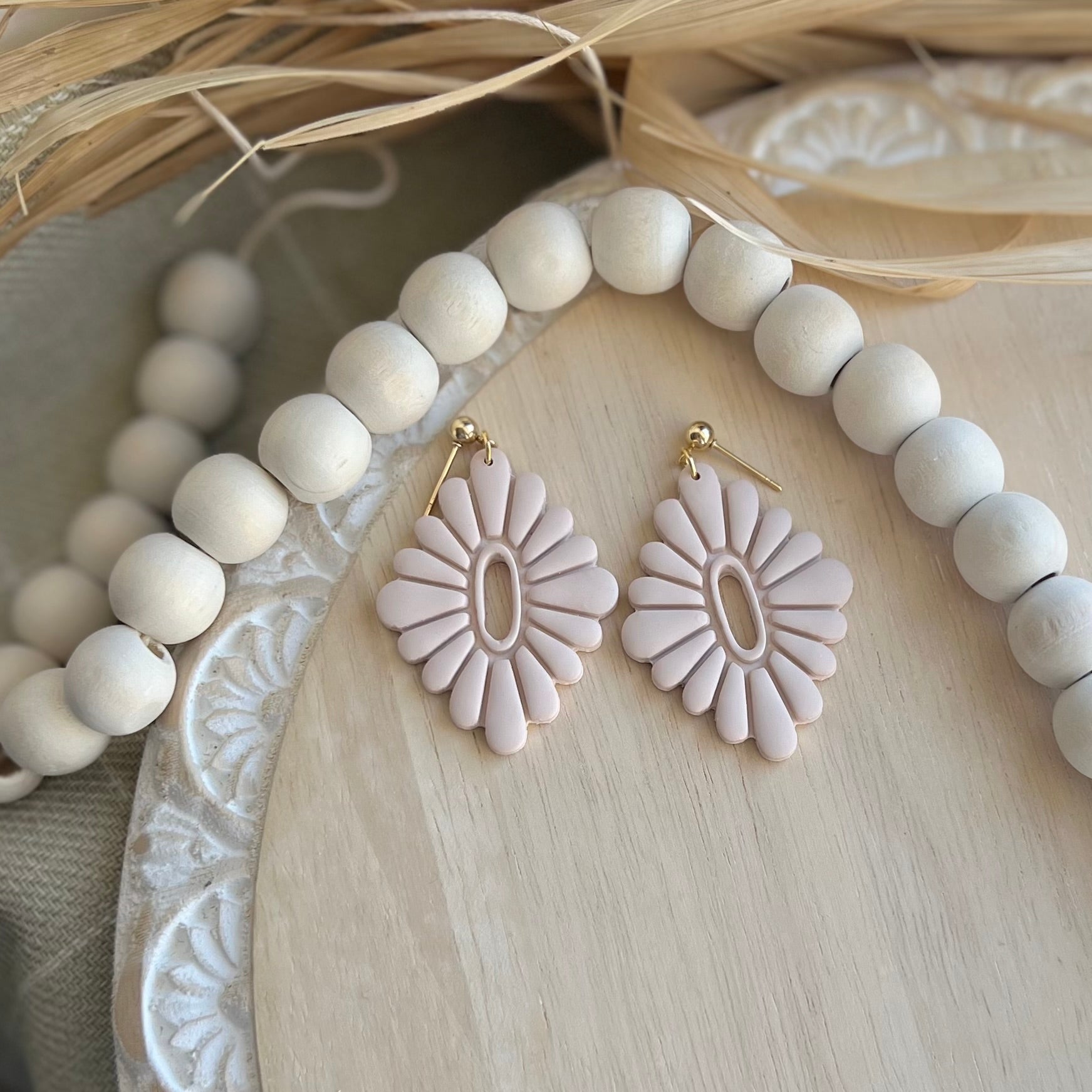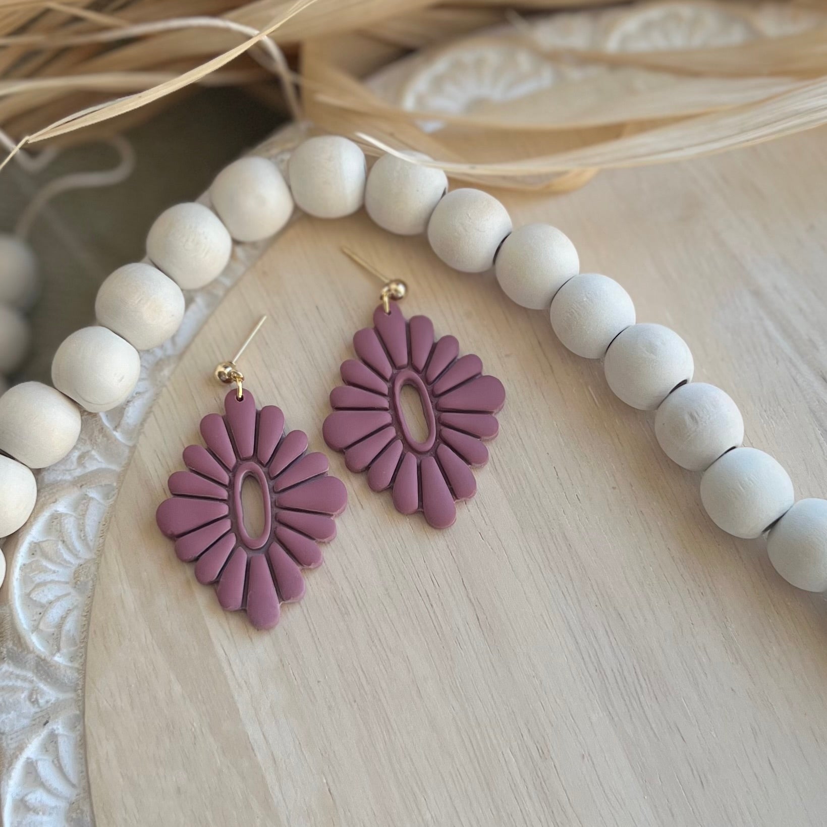 Boho, Feminine Polymer Clay Dangle Earrings on gold plated ball stud. Lightweight, durable polymer clay. 25% of all sales donated to rescuing women from sexual exploitation.