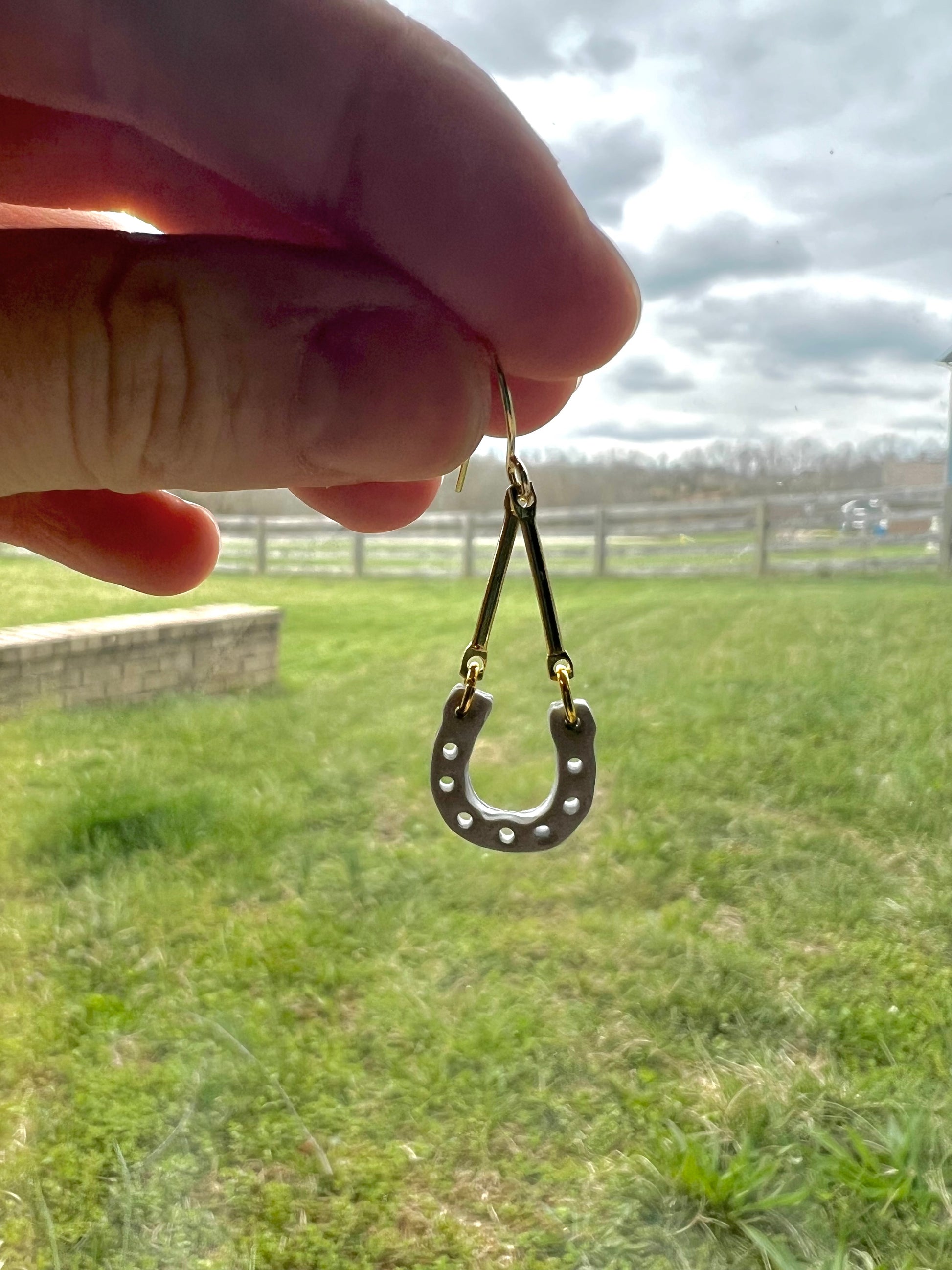 Dainty Light grey clay horseshoes with bar connectors and gold plated hooks. Lightweight, durable polymer clay. 25% of all sales donated to rescuing women from sexual exploitation.