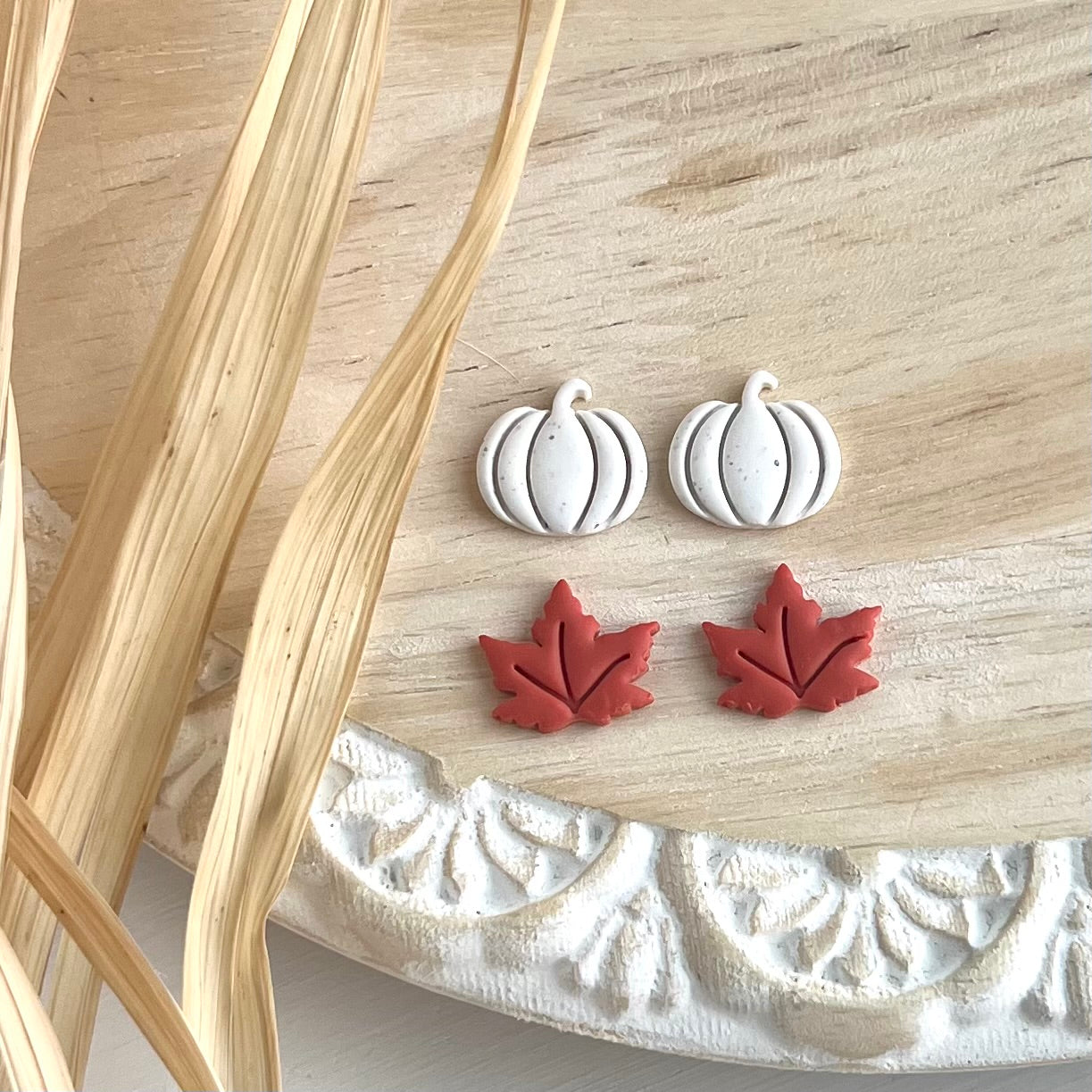 Creamy Pumpkins and Squash color embossed fall leaf clay studs on 12k gold plated posts sealed with resin. 25% of all sales donated to rescuing women from sexual exploitation.
