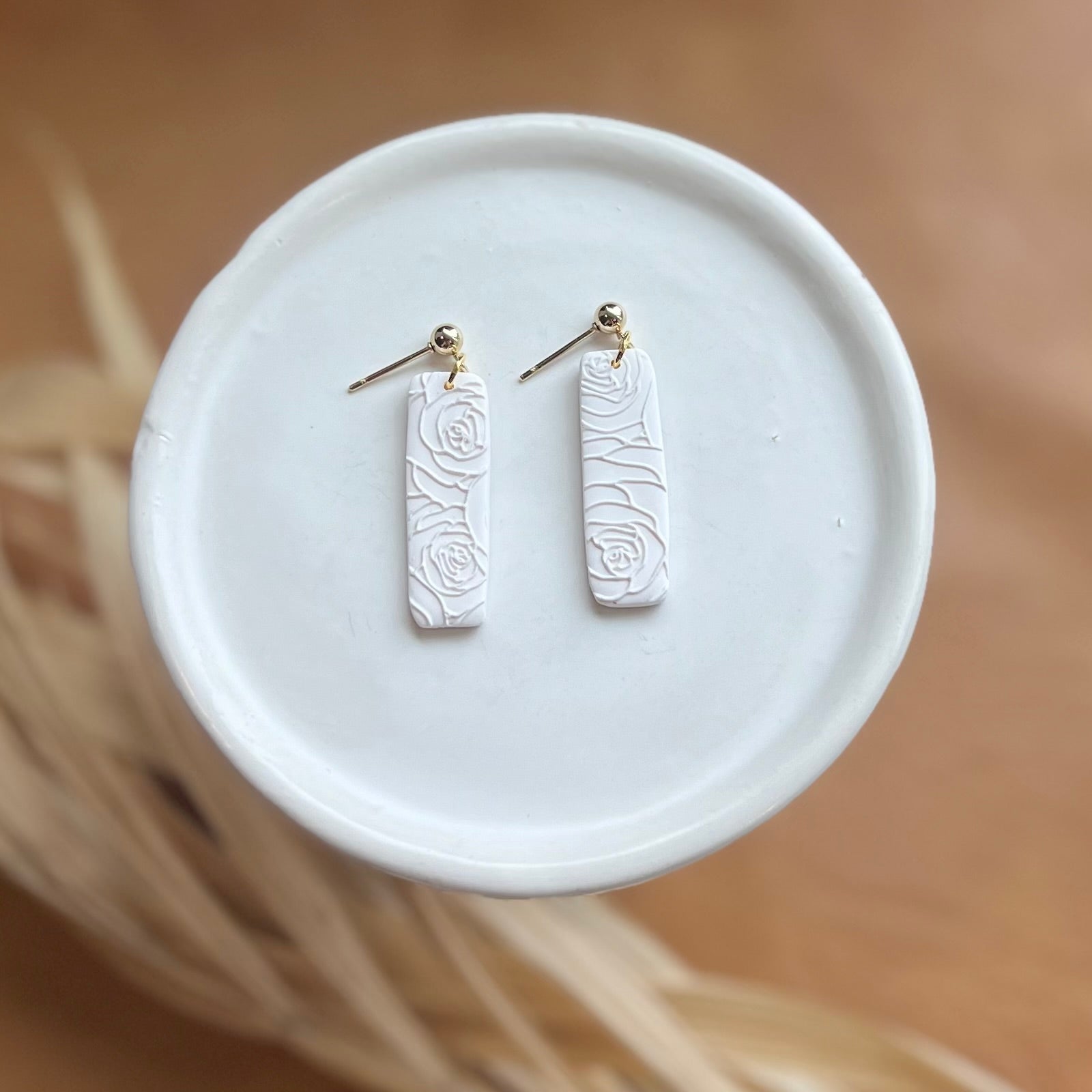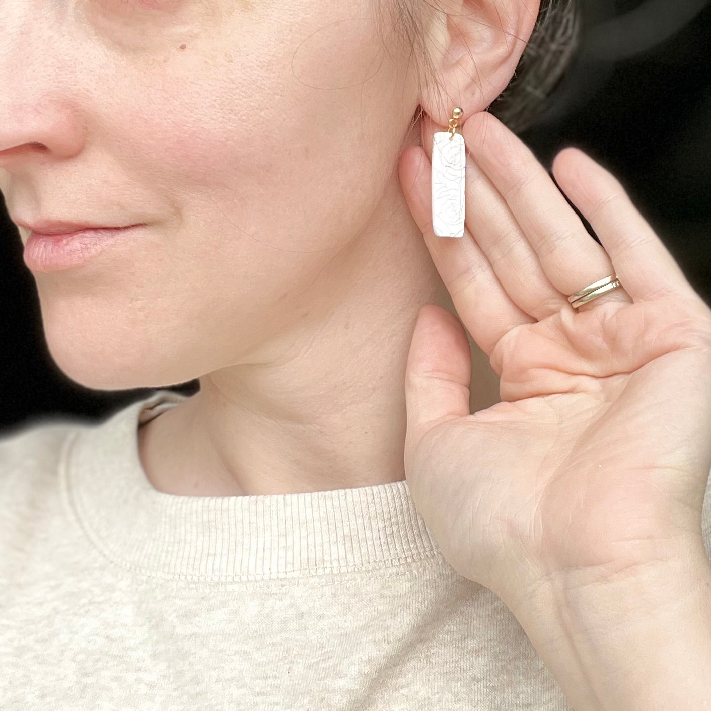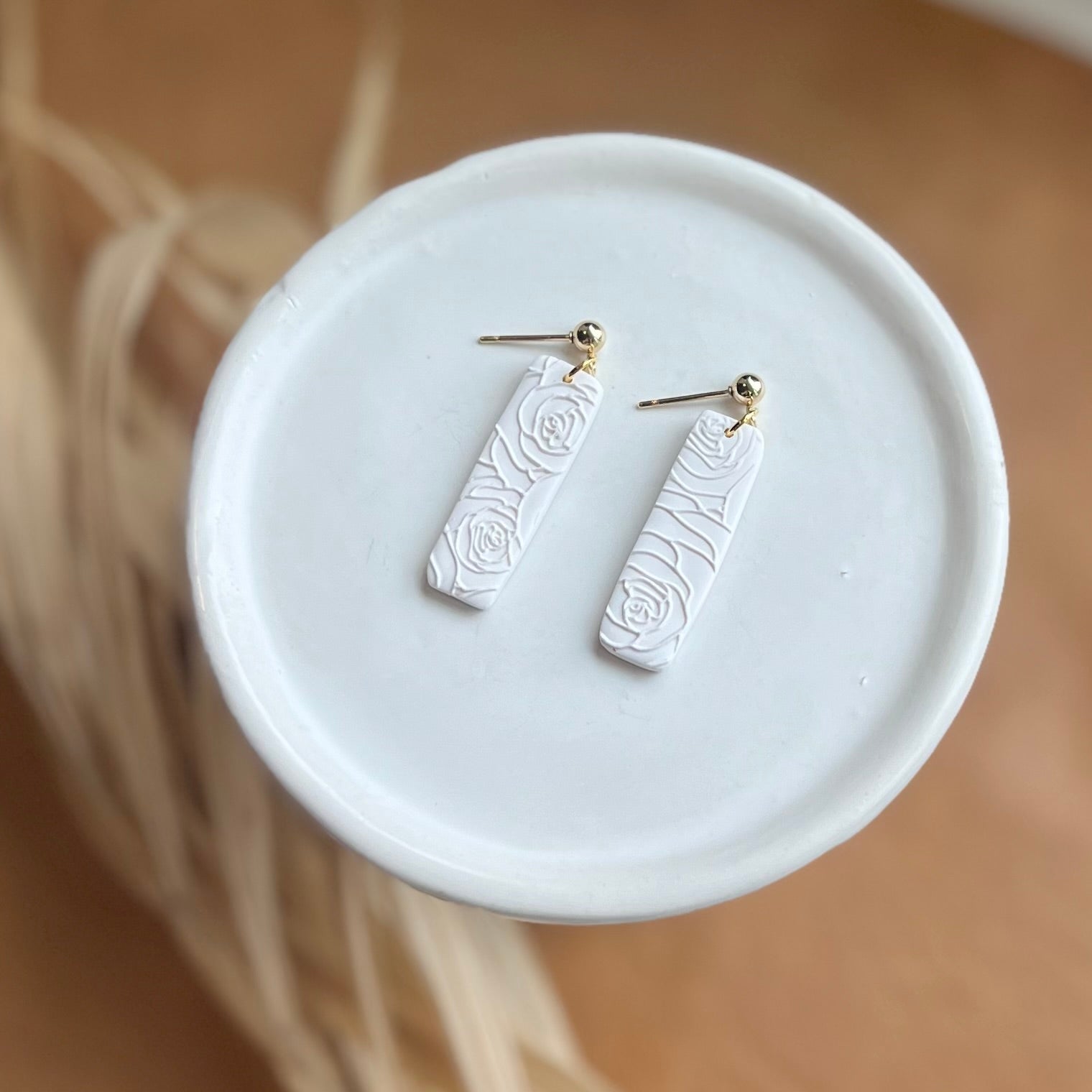 Our classic Cassie Dangles in a white rose texture on 12k gold plated ball posts. Lightweight, durable polymer clay. 25% of all sales donated to rescuing women from sexual exploitation.