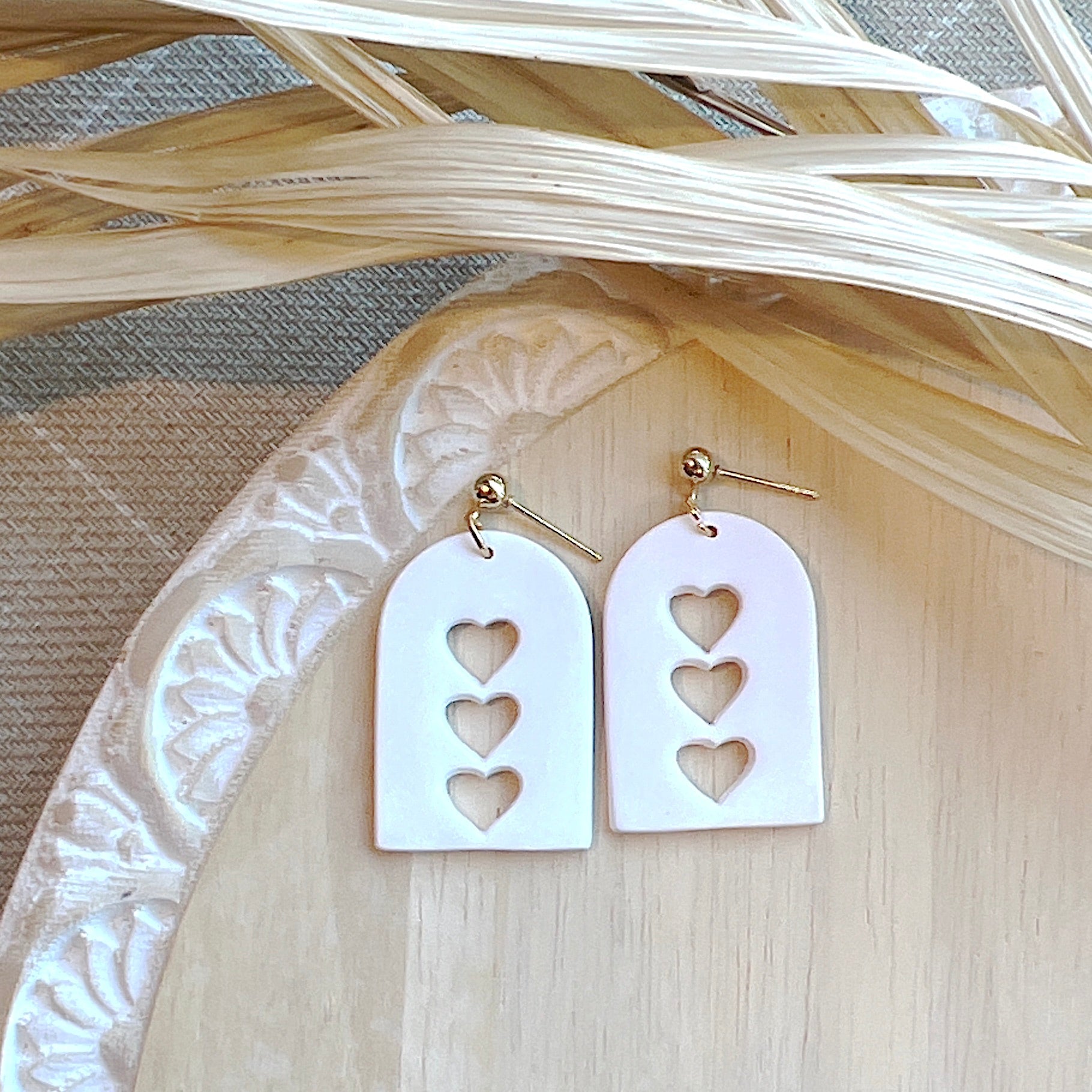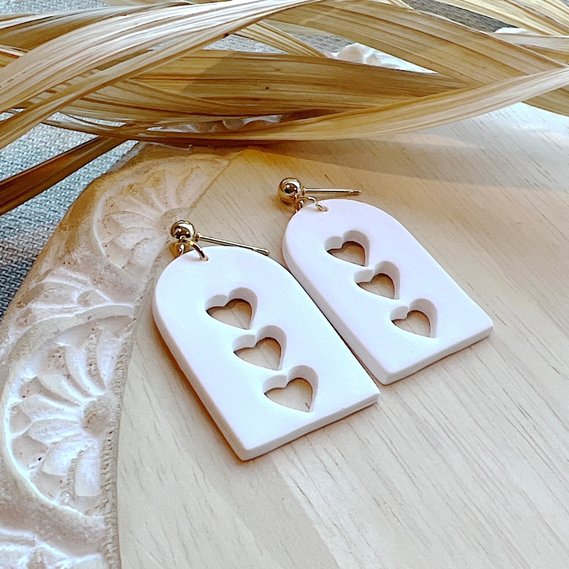 Arich plaque dangles with three cutout hearts on 12k gold plated ball posts. 25% of every sale provides safety, care and hope to exploited women in Kentucky.