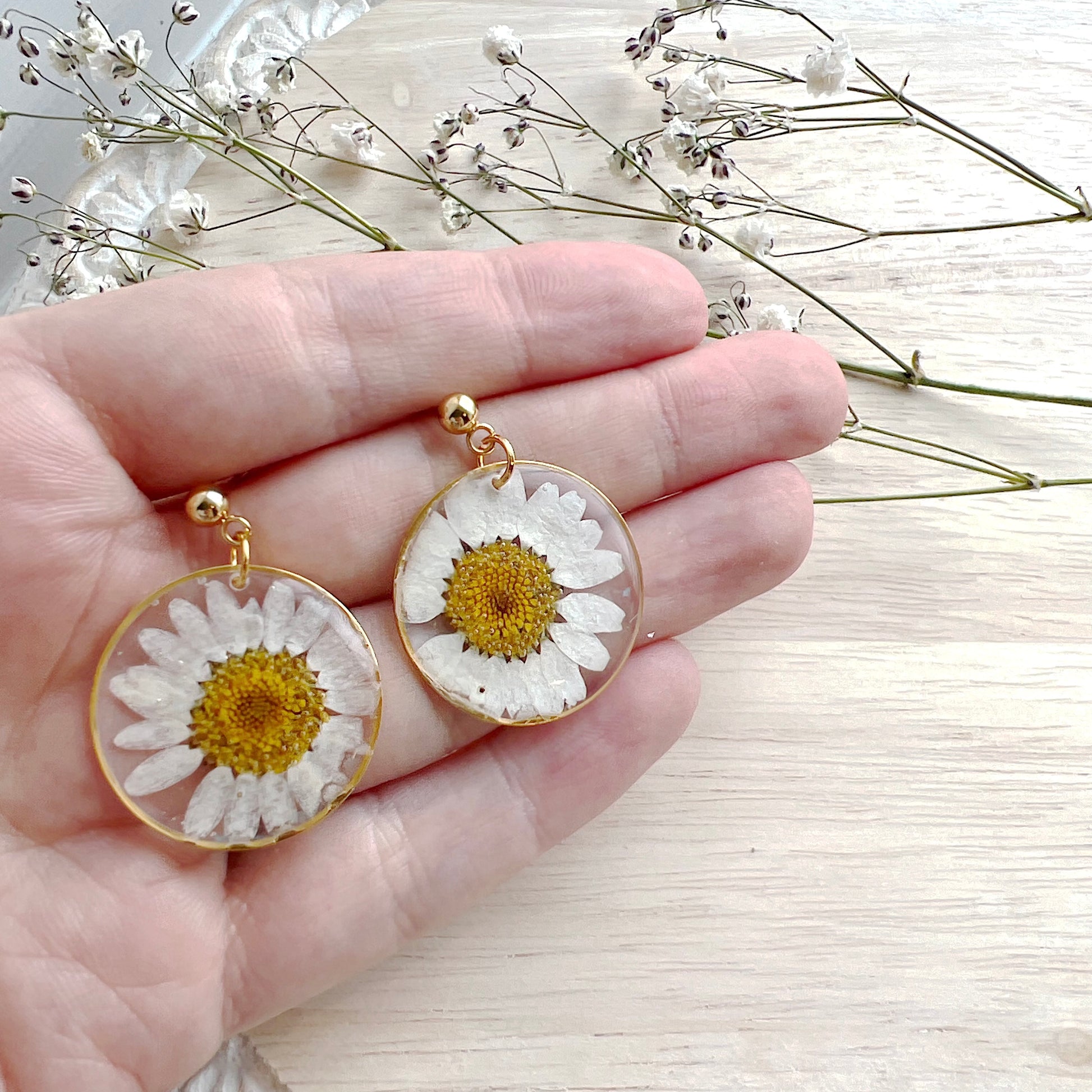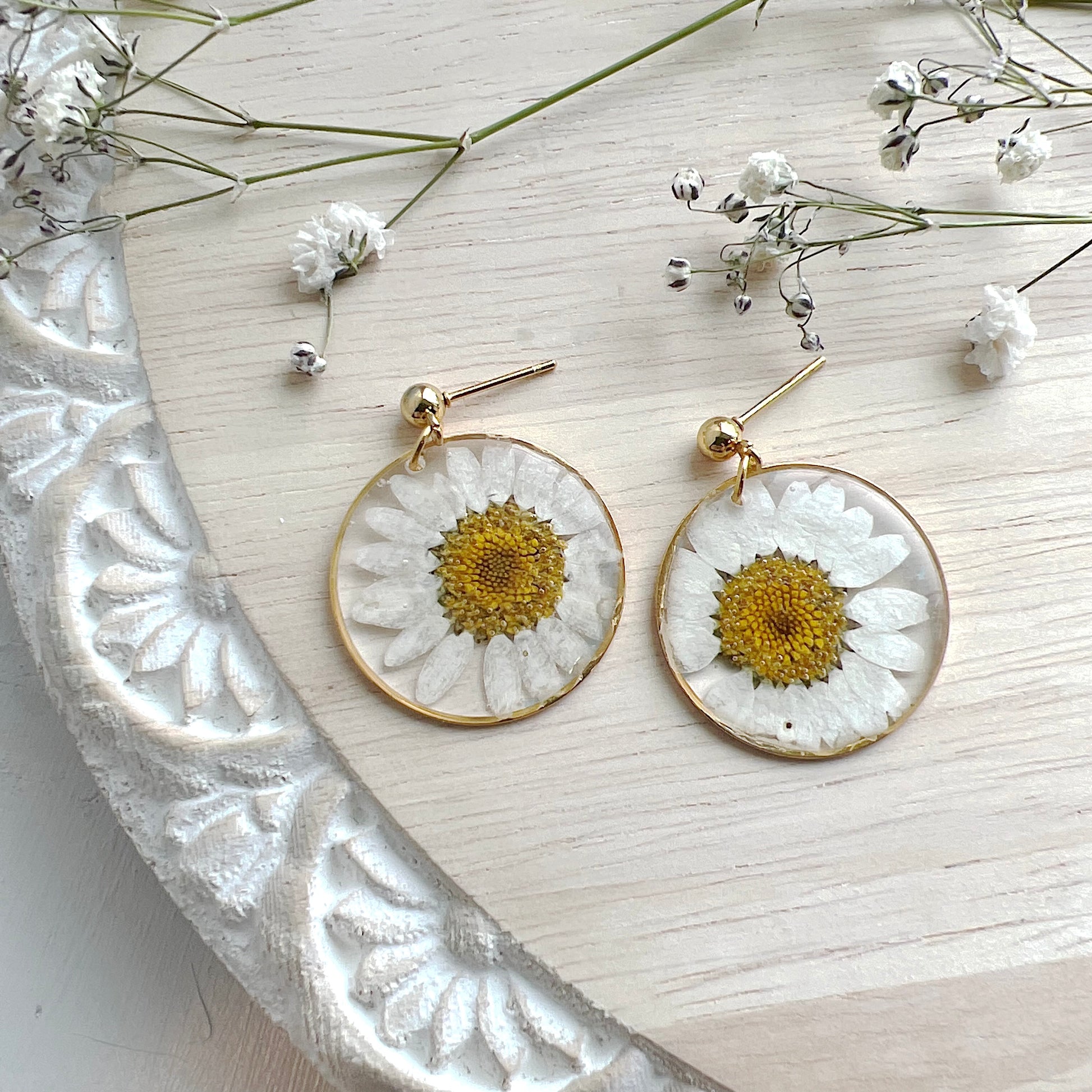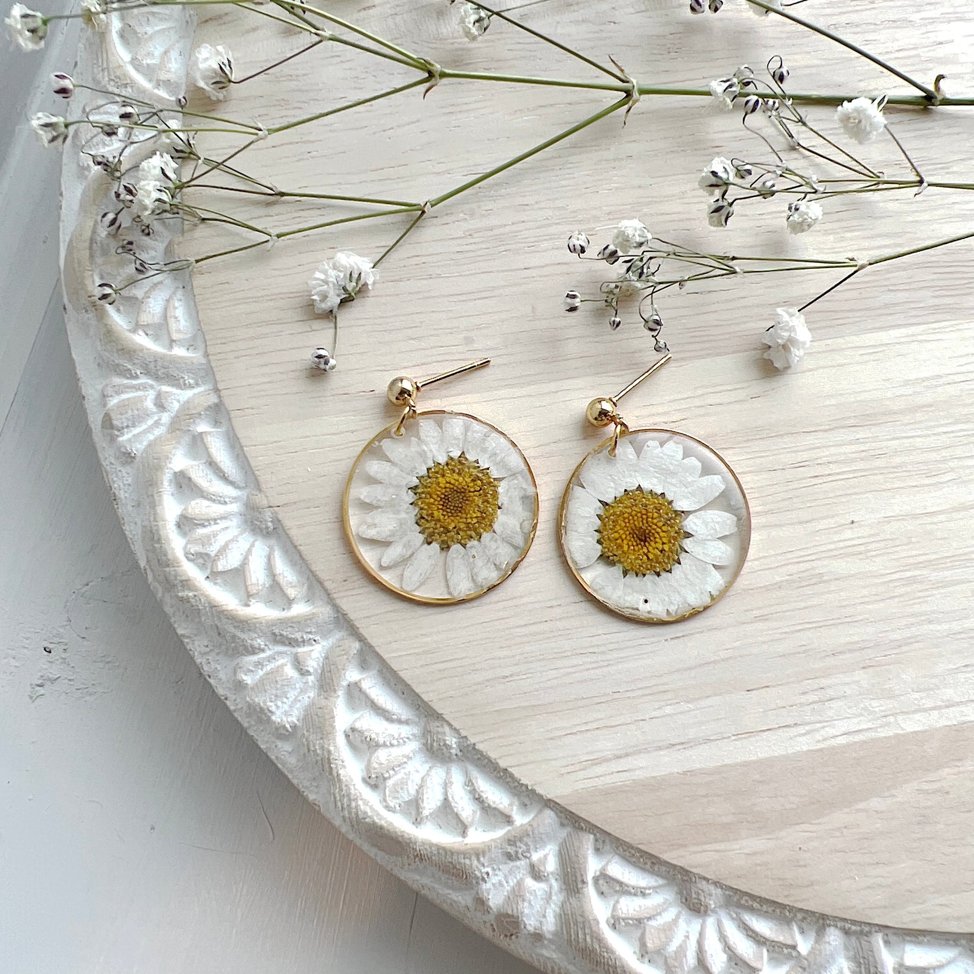Resin sealed pressed flowers inside stainless steel circle with 12k gold plated ball post.