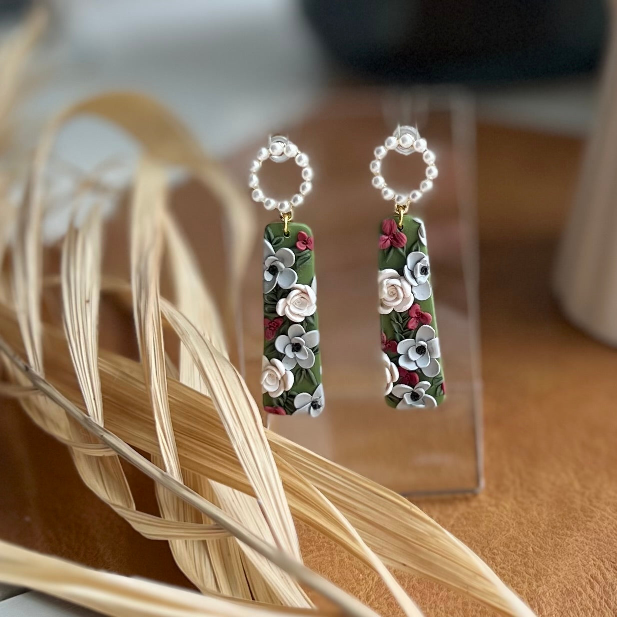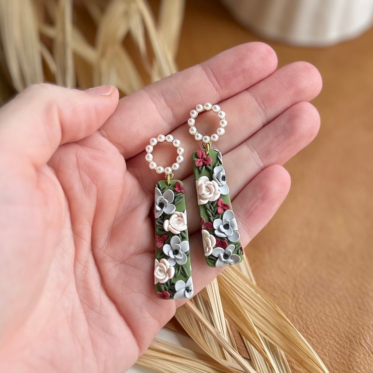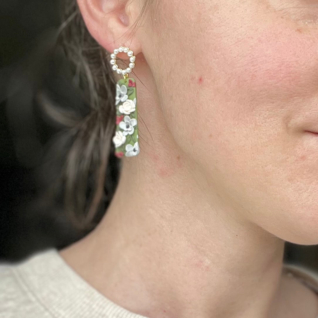 Long trapezoid derby floral slab dangles with pearl circle stainless steel finding. Lightweight, durable polymer clay. 25% of all sales donated to rescuing women from sexual exploitation.