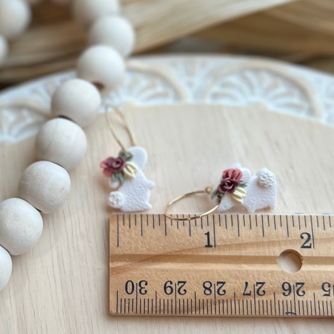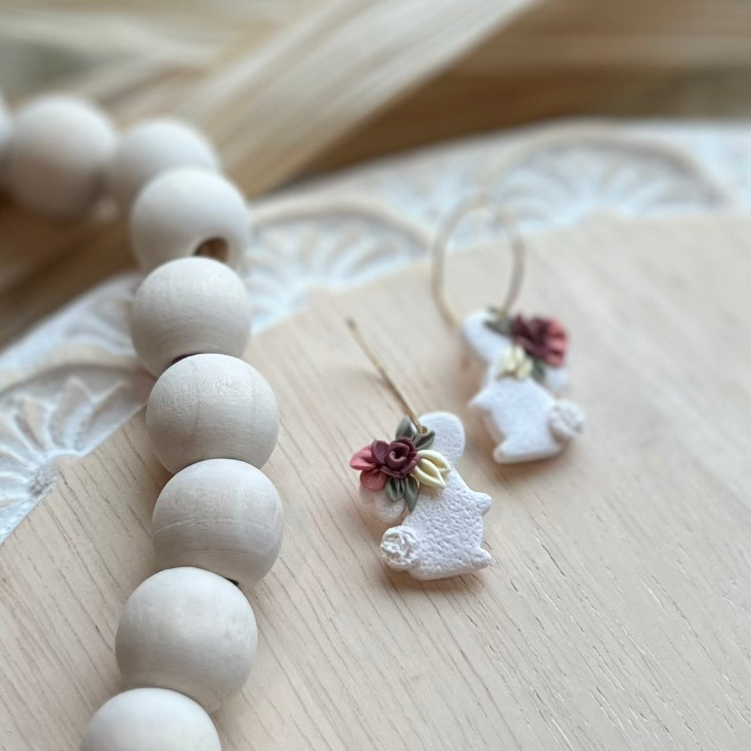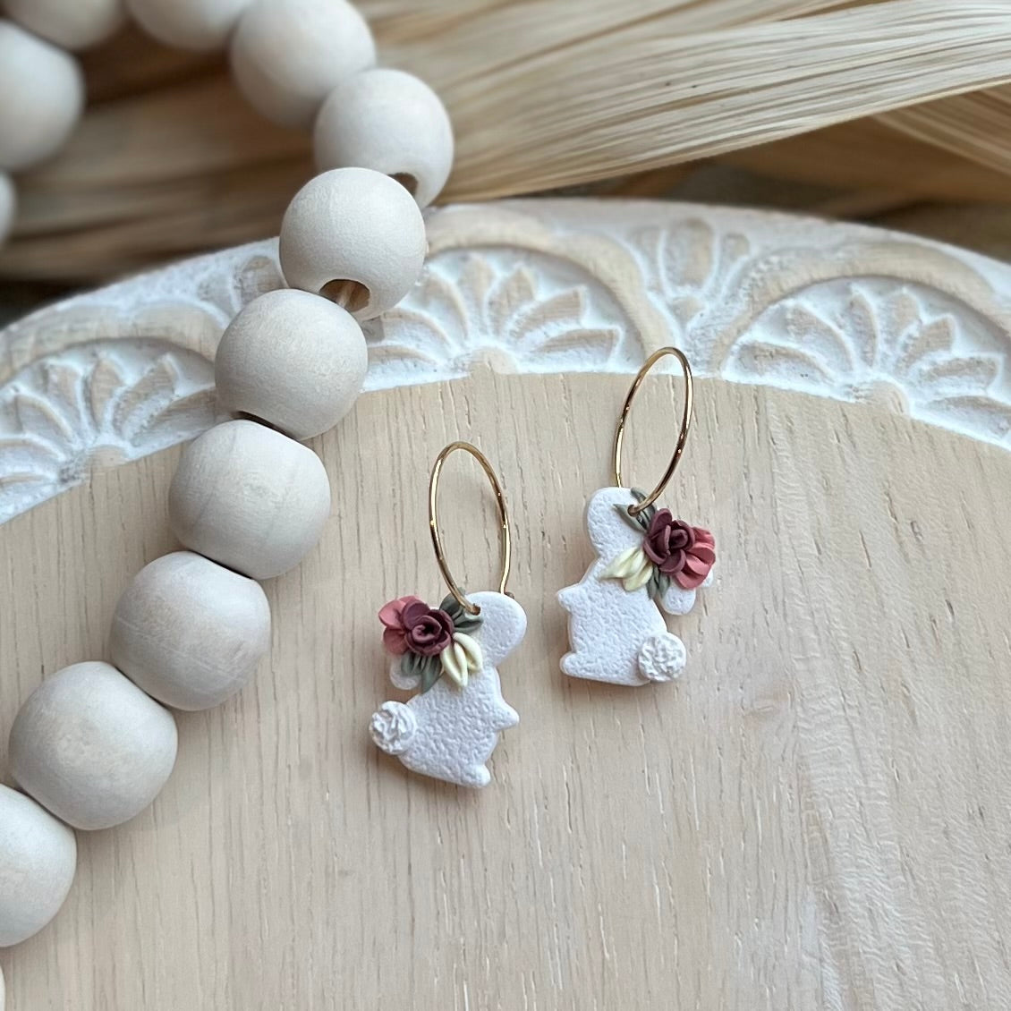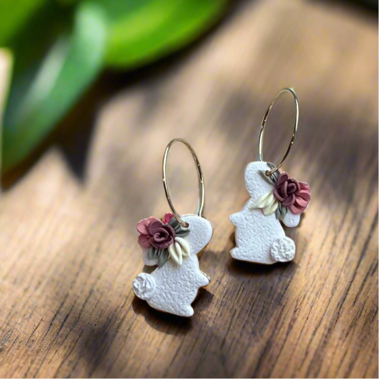 Textured white clay bunny with floral crown on 15mm (petite) gold plated hoops. Lightweight, durable polymer clay. 25% of all sales donated to rescuing women from sexual exploitation.
