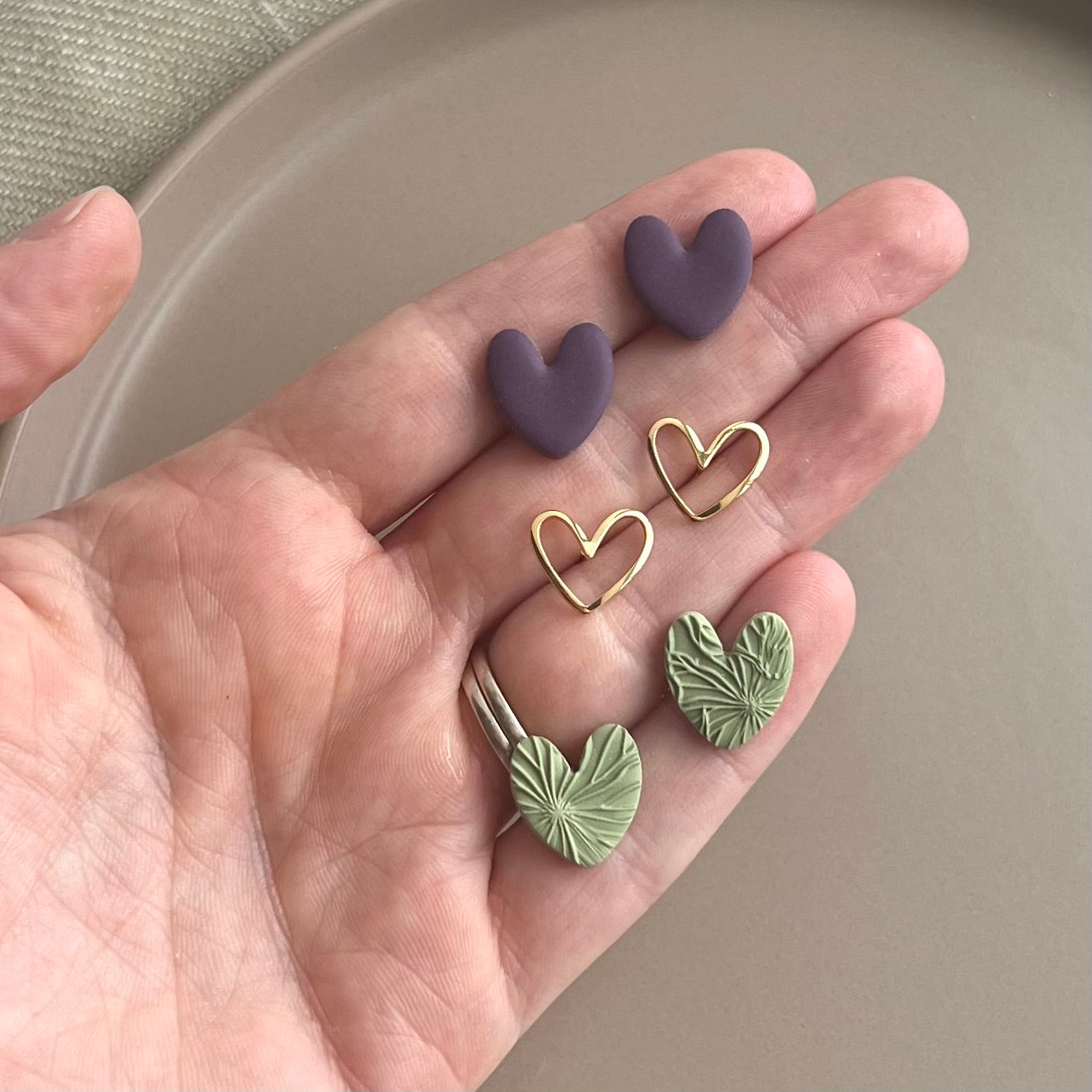Eggplant solid hearts, pen gold plated hearts, and textured aloe green hearts on 12k gold plated posts sealed with resin. Lightweight, durable polymer clay. 25% of all sales donated to rescuing women from sexual exploitation.