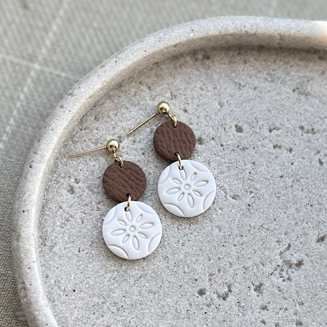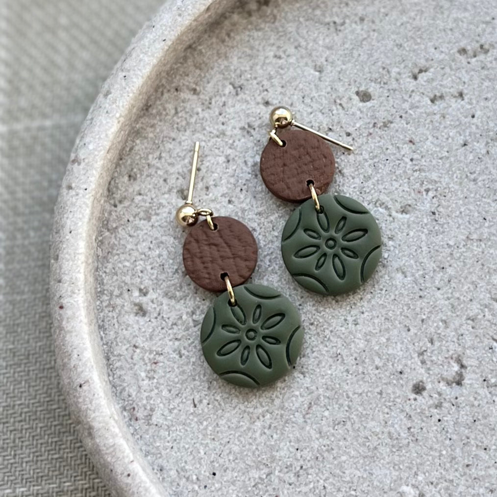 Felicity clay charm with “leather effect” clay connector on 12k gold plated ball studs in a variety of colors. 25% of all sales donated to rescuing women from sexual exploitation.