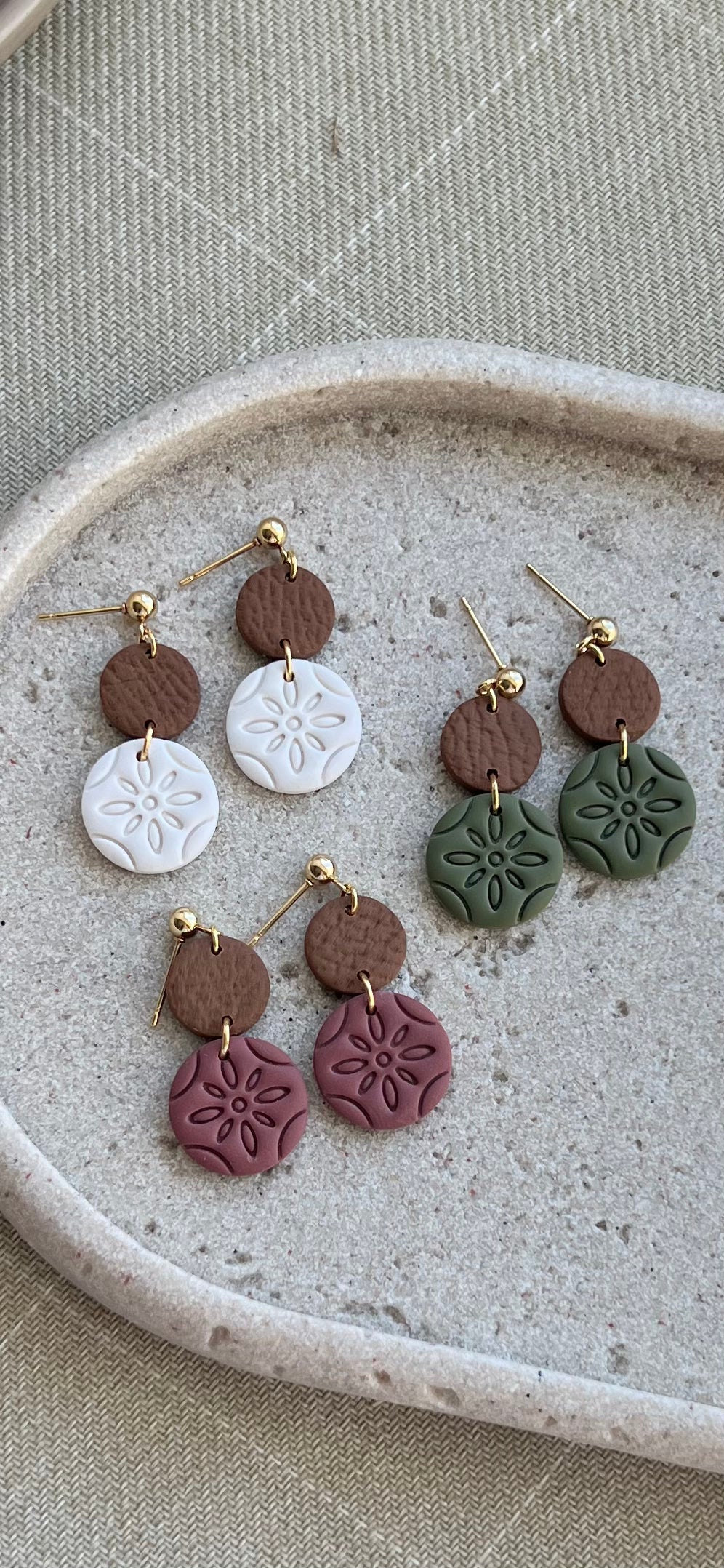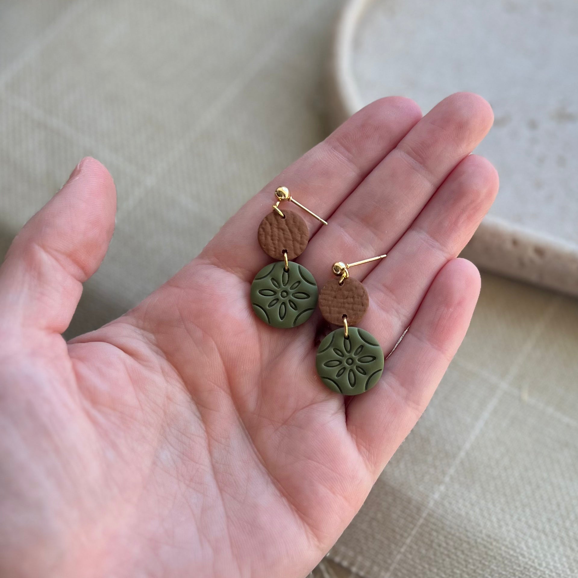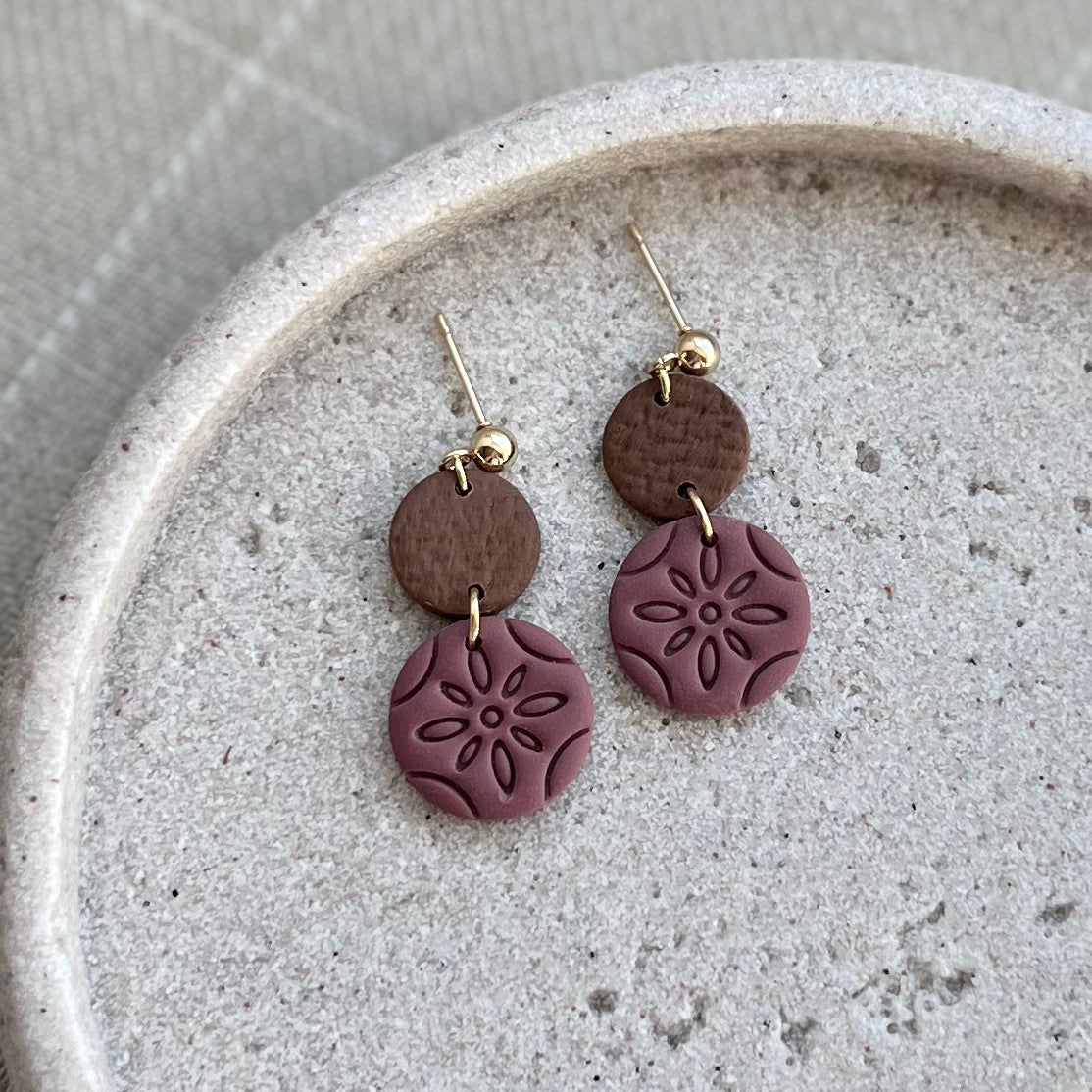 Each item is handmade so variations may exist in the texture, edging and finish. The posts are doubly reinforced with a specialized glue and finishing glaze. Earrings should never be submerged in water. A small fall should not break them; however, please handle them with care to ensure they stay in excellent shape.