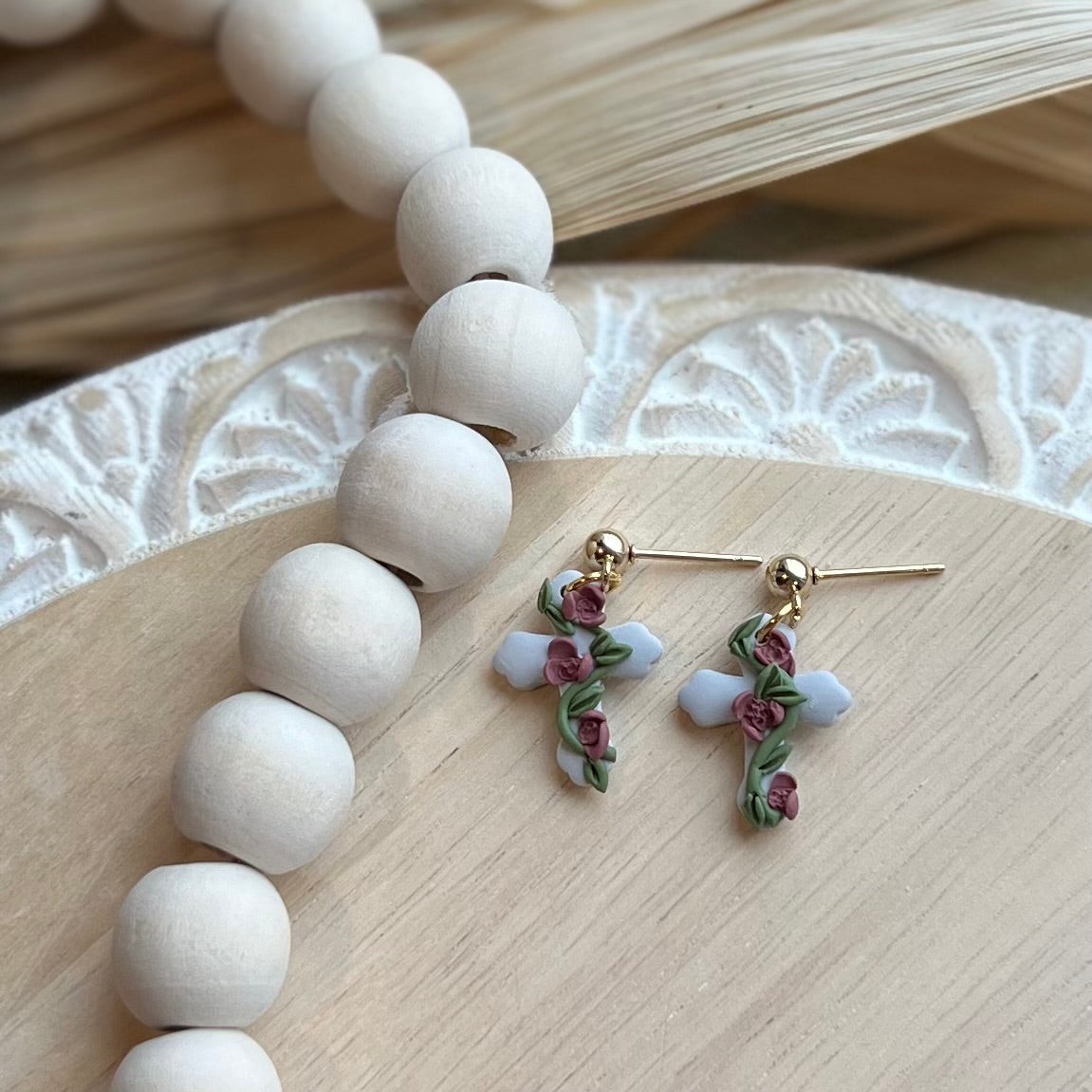 Grey Crosses with greenery and 3D flowers on 12k gold plated ball posts. Lightweight, durable polymer clay. 25% of all sales donated to rescuing women from sexual exploitation.