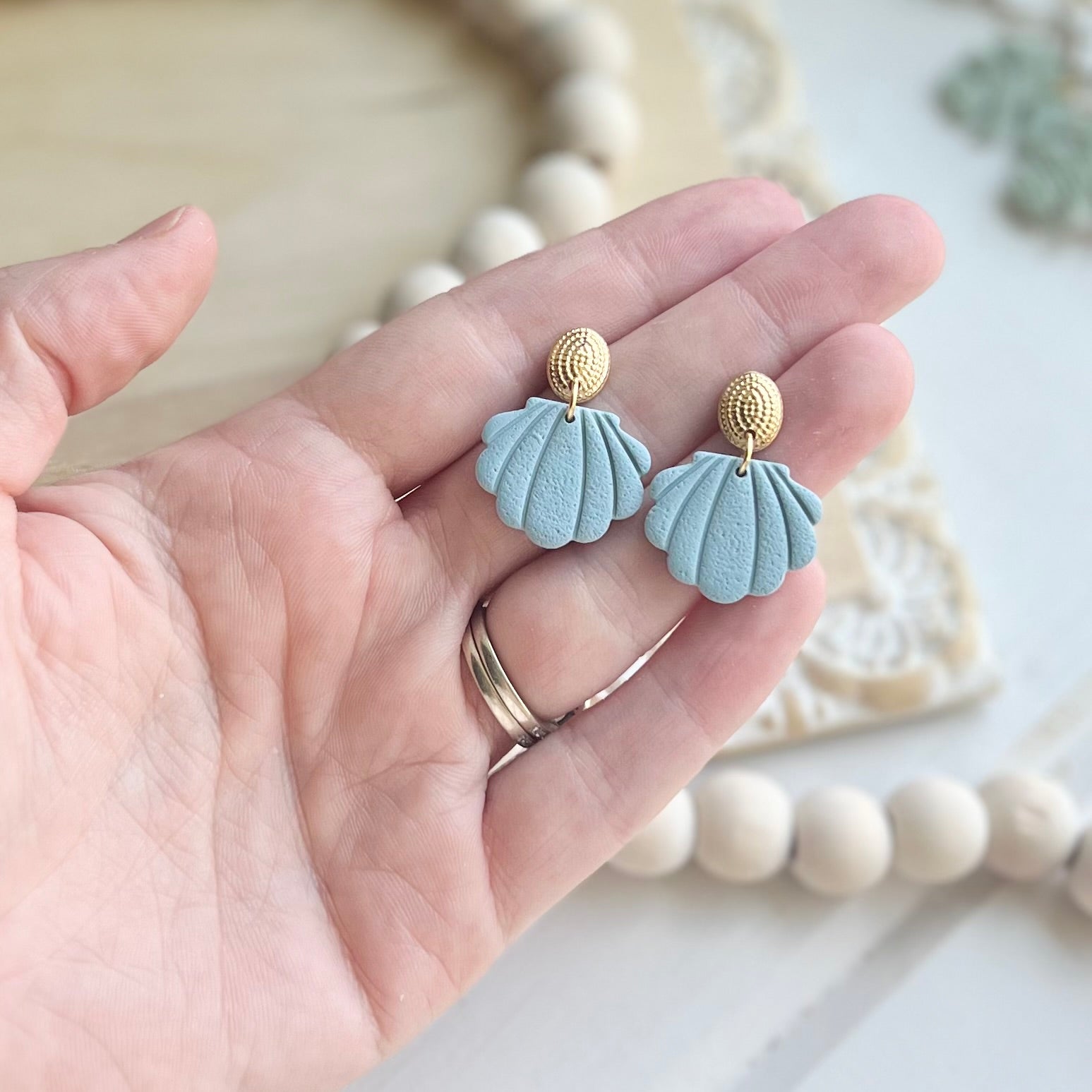 Textured, embossed shells on gold plated brass hammered oval findings. Lightweight, durable polymer clay. 25% of all sales donated to rescuing women from sexual exploitation.