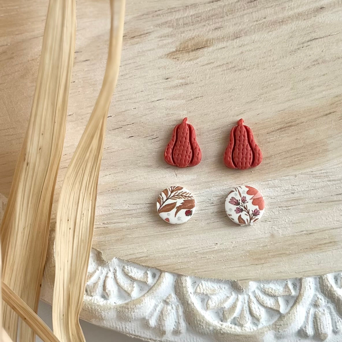 Saffron color knit embossed gourds and fall harvest print circle studs on 12k gold plated posts sealed with resin. 25% of all sales donated to rescuing women from sexual exploitation.