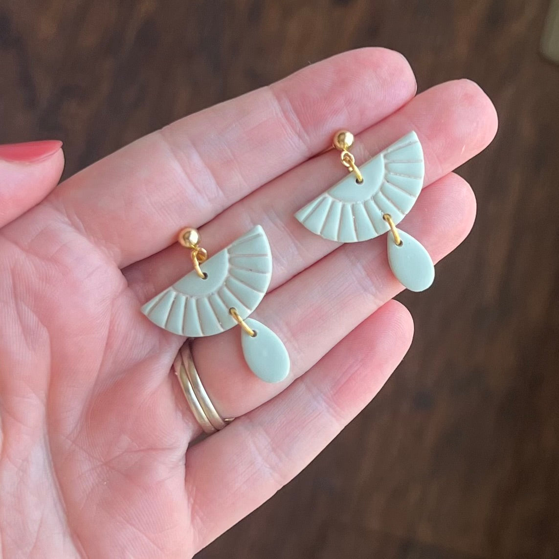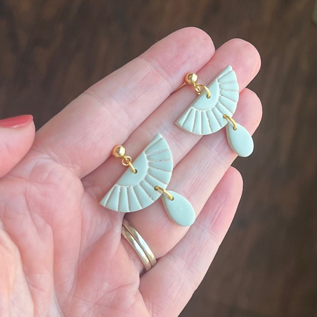 Smaller version of the Liana Dangles with the fan and drop charms only. Cream colored "grout" effect inside sunburst embossed design. 25% of all sales donated to rescuing women from sexual exploitation.