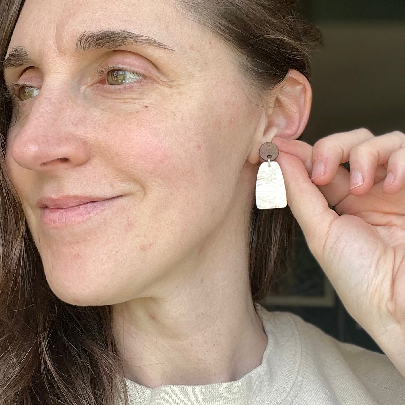 Norah Dangles on wood circle findings featured in hand mixed Pristine Abalone Clay. This clay has a naturally glossy, translucent effect when the light hits it. 25% of all sales donated to rescuing women from sexual exploitation.