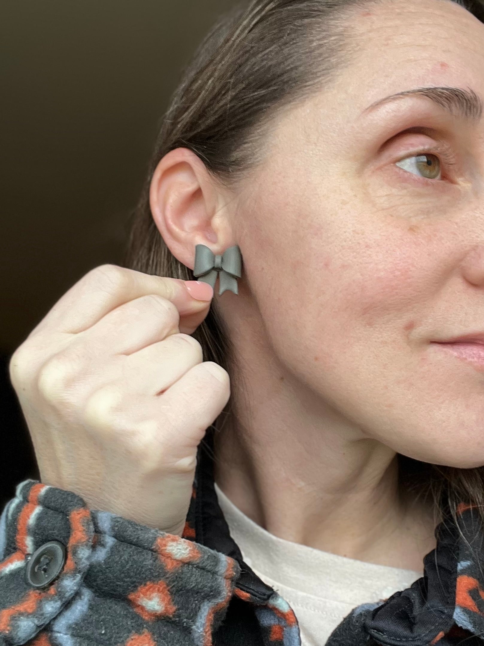 3D ribbon bows in stormy teal on 12k gold plated posts sealed with resin.