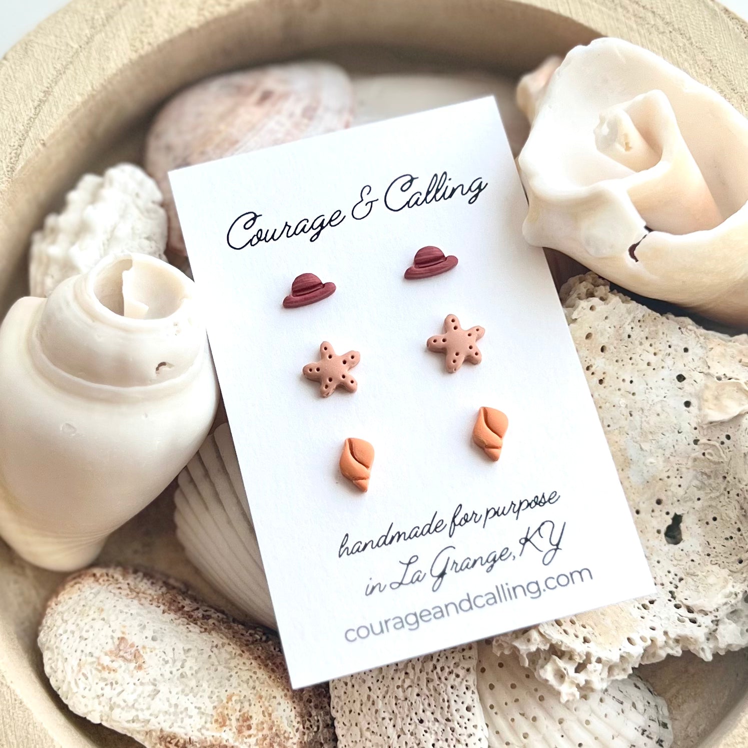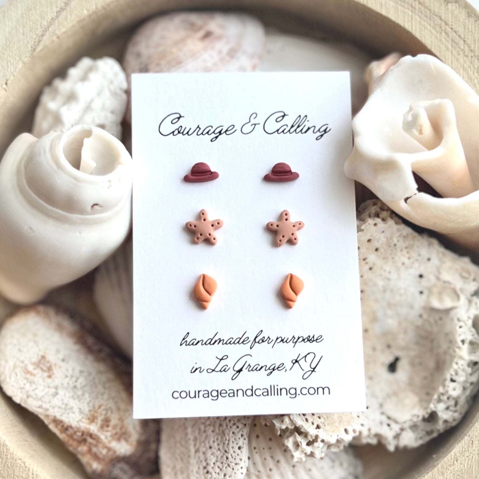 Micro grapefruit sun hats, muted coral sea stars, and melon conch shells on 12k gold plated posts sealed with resin. Lightweight, durable polymer clay. 25% of all sales donated to rescuing women from sexual exploitation.