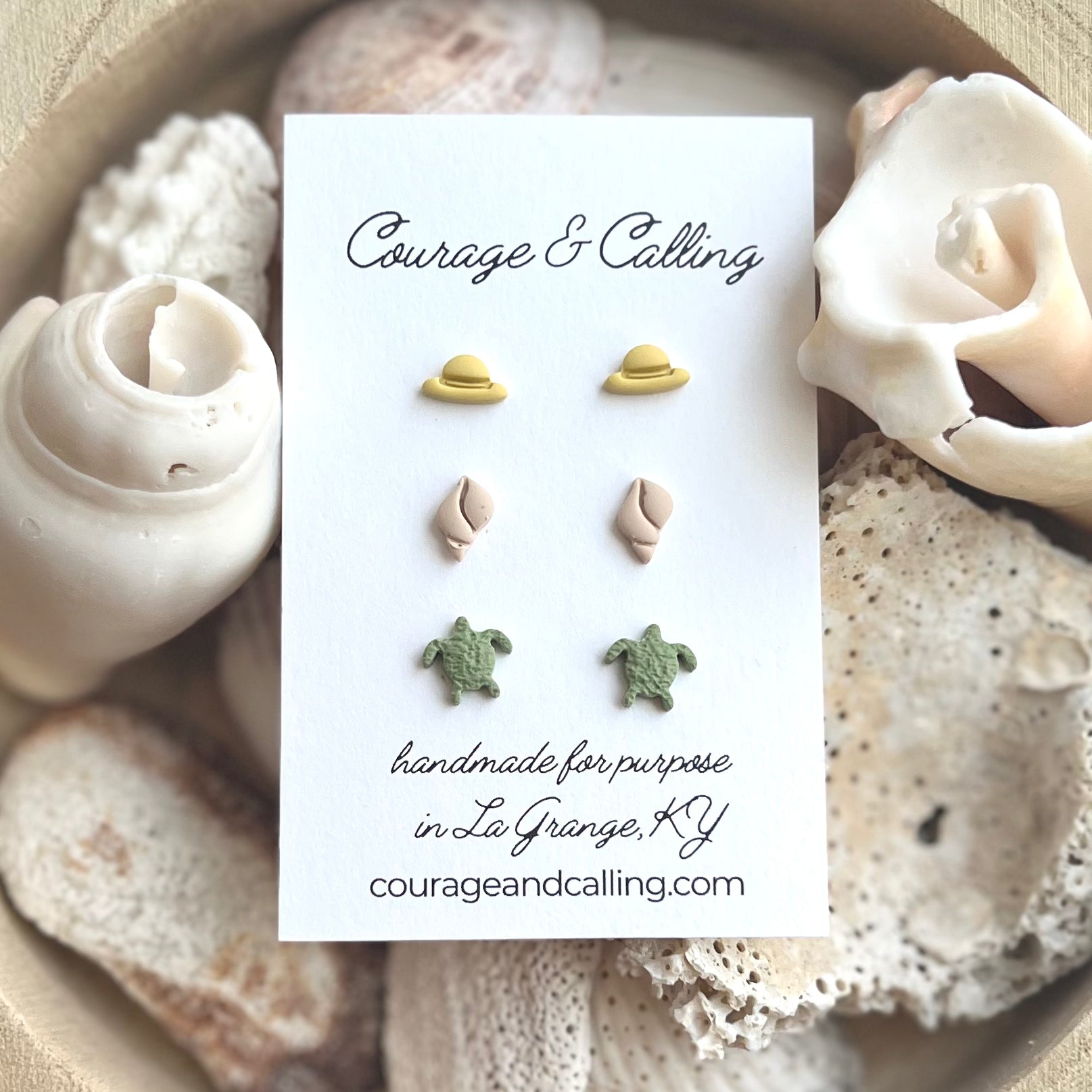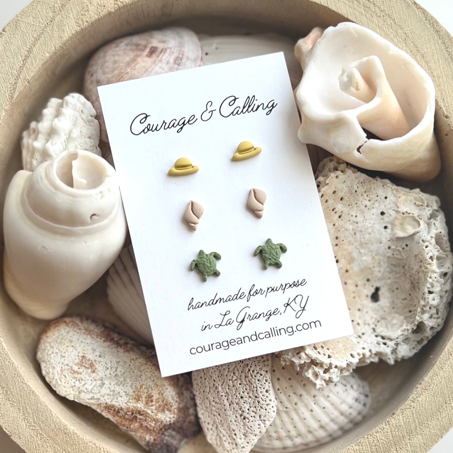 Micro daffodil sun hats, dune conch shells, and aloe sea turtles on 12k gold plated posts sealed with resin. Lightweight, durable polymer clay. 25% of all sales donated to rescuing women from sexual exploitation.