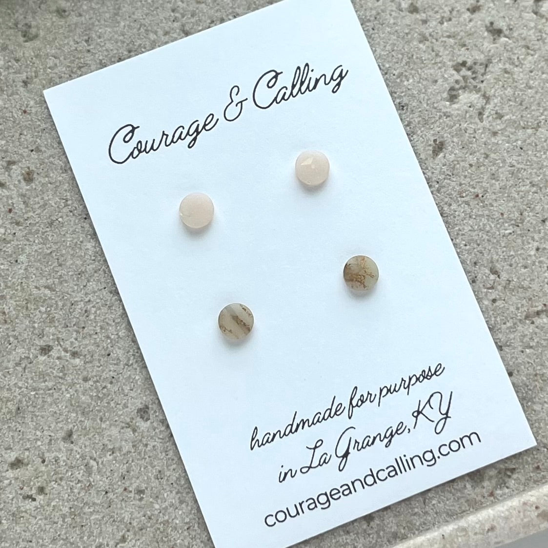 Two micro circle pairs of studs, one in seaglass and one in opaline on 12k gold plated posts sealed with resin. Lightweight, durable polymer clay. 25% of all sales donated to rescuing women from sexual exploitation.