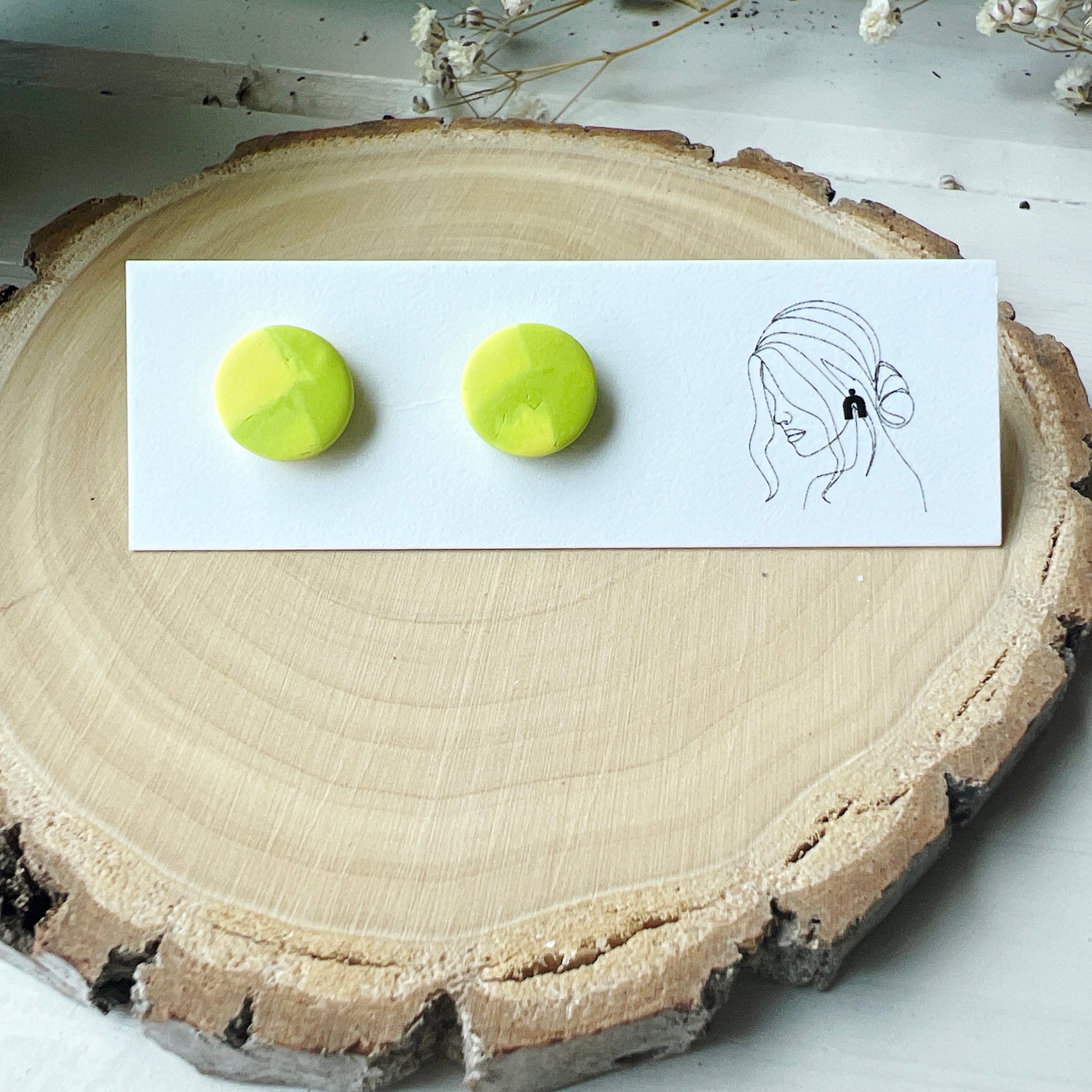 Two tone clay earring circle studs on 12k gold plated posts. Available in two colors: lemon lime and sunset orange.