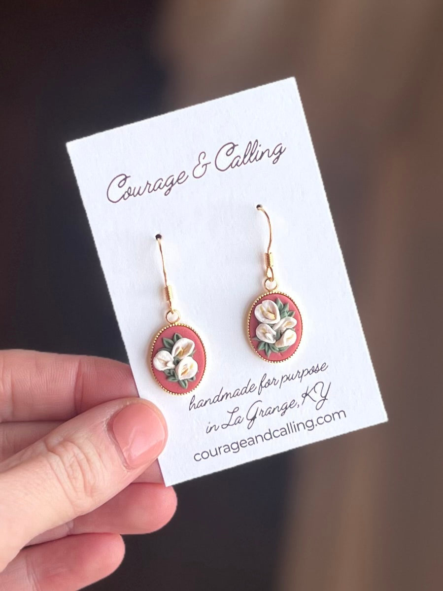 .75" oval gold frame Calla Lilly earrings. Lightweight, durable polymer clay. 25% of all sales donated to rescuing women from sexual exploitation.