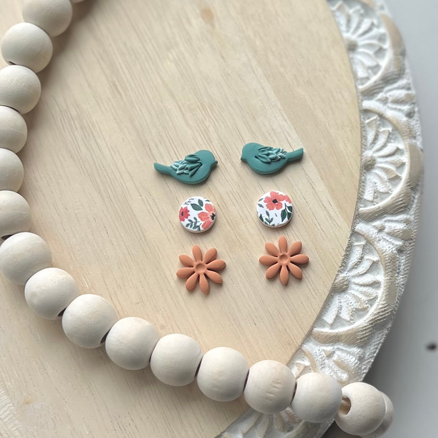 Teal robins with ombré feathers, spring garden print circles, terra cotta daisies all on 12k gold plated posts sealed with resin.