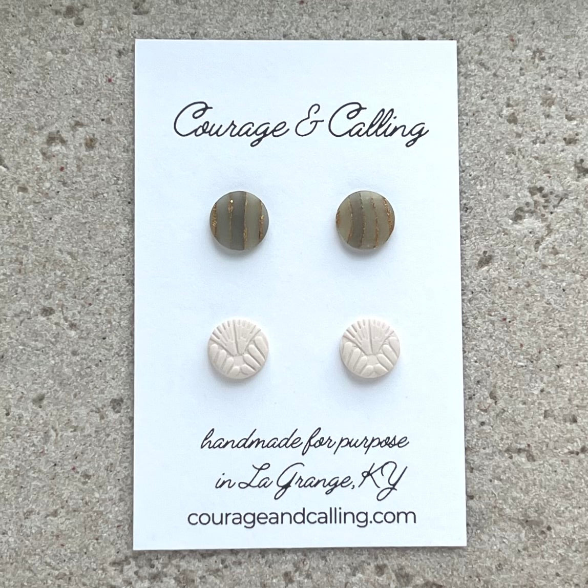 Two circle pairs of standard size .5" studs, one in seaglass and one in textured cream, on 12k gold plated posts sealed with resin. Lightweight, durable polymer clay. 25% of all sales donated to rescuing women from sexual exploitation.