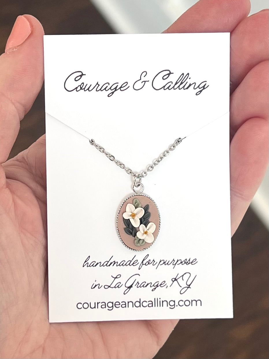 Silver Oval Botanical Frame Necklace in Almond Rose