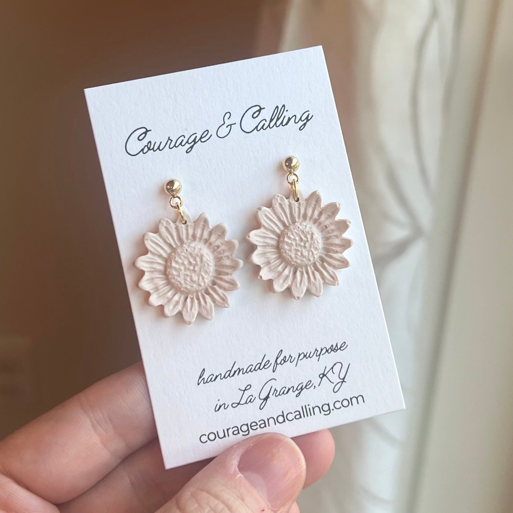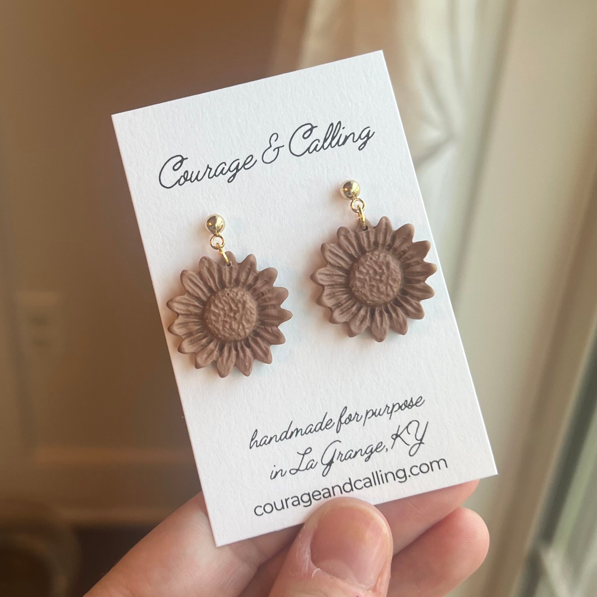 Light Tan or Saddle Brown clay sunflowers made from a mold and hanging from 12k gold plated ball posts. 25% of all sales donated to rescuing women from sexual exploitation.
