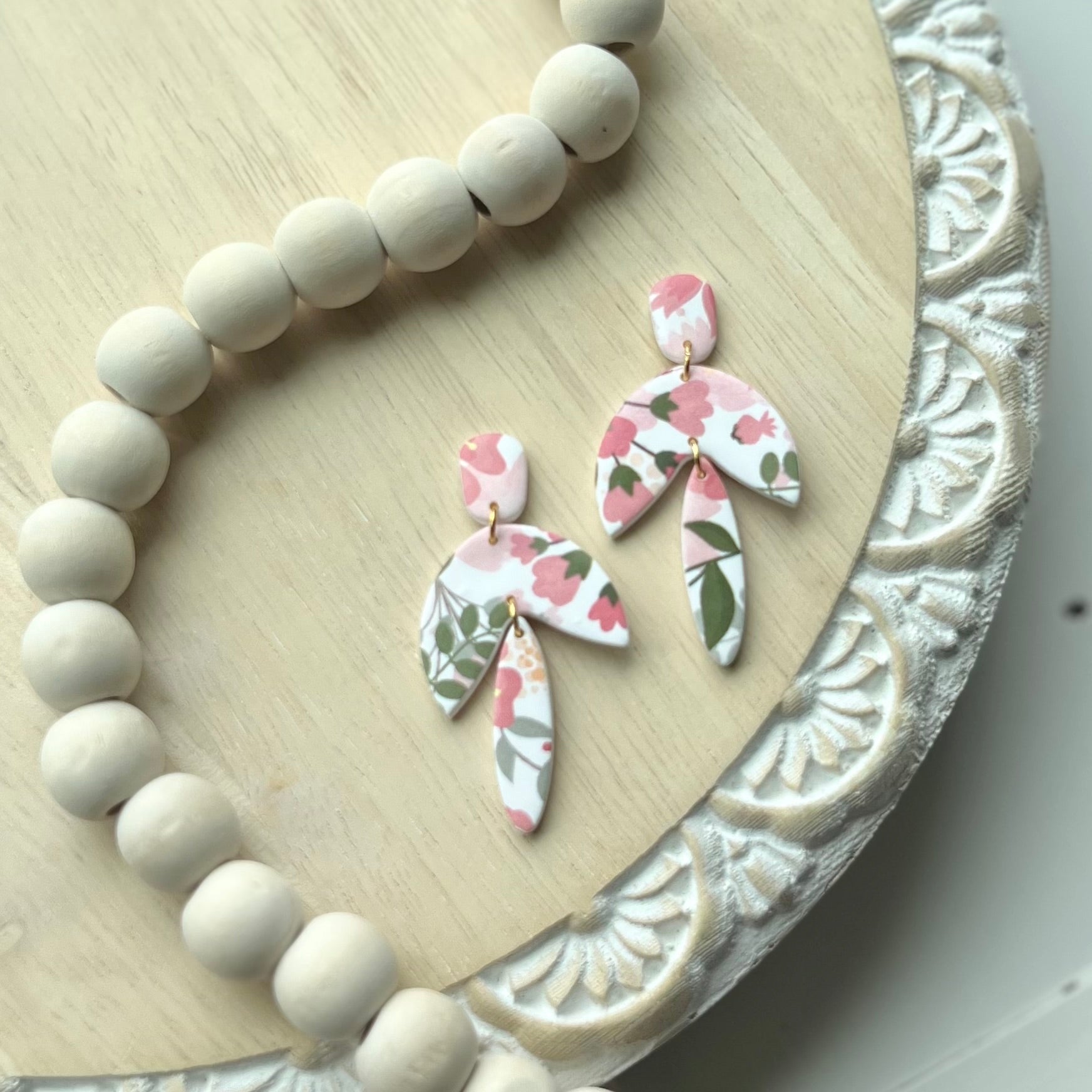 Talia dangles with pink and green wildflower transfer print on 12k gold plated posts. Lightweight, durable polymer clay. 25% of all sales donated to rescuing women from sexual exploitation.