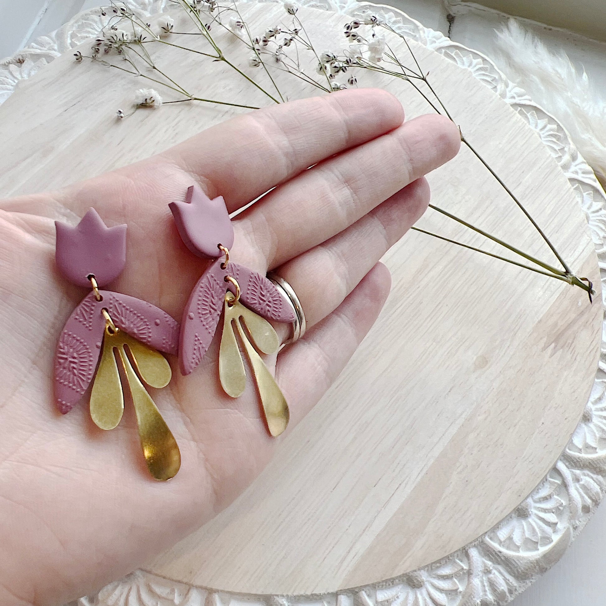 Clay tulip and textured leaf with brass leaf charm. Lightweight, durable polymer clay. 25% of all sales donated to rescuing women from sexual exploitation.