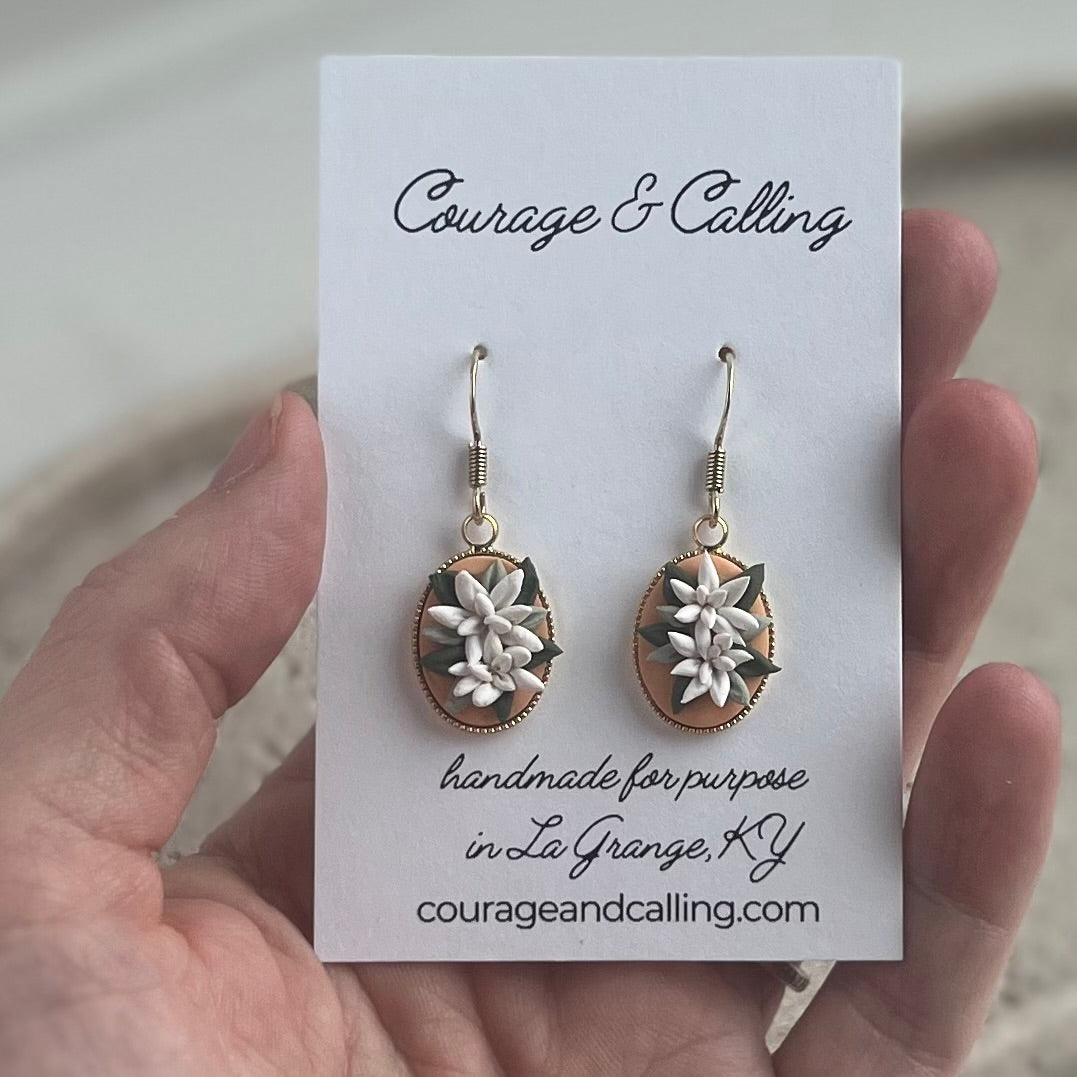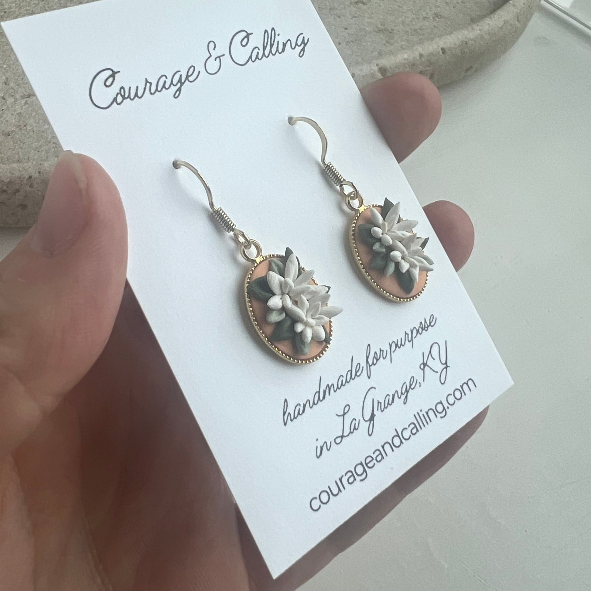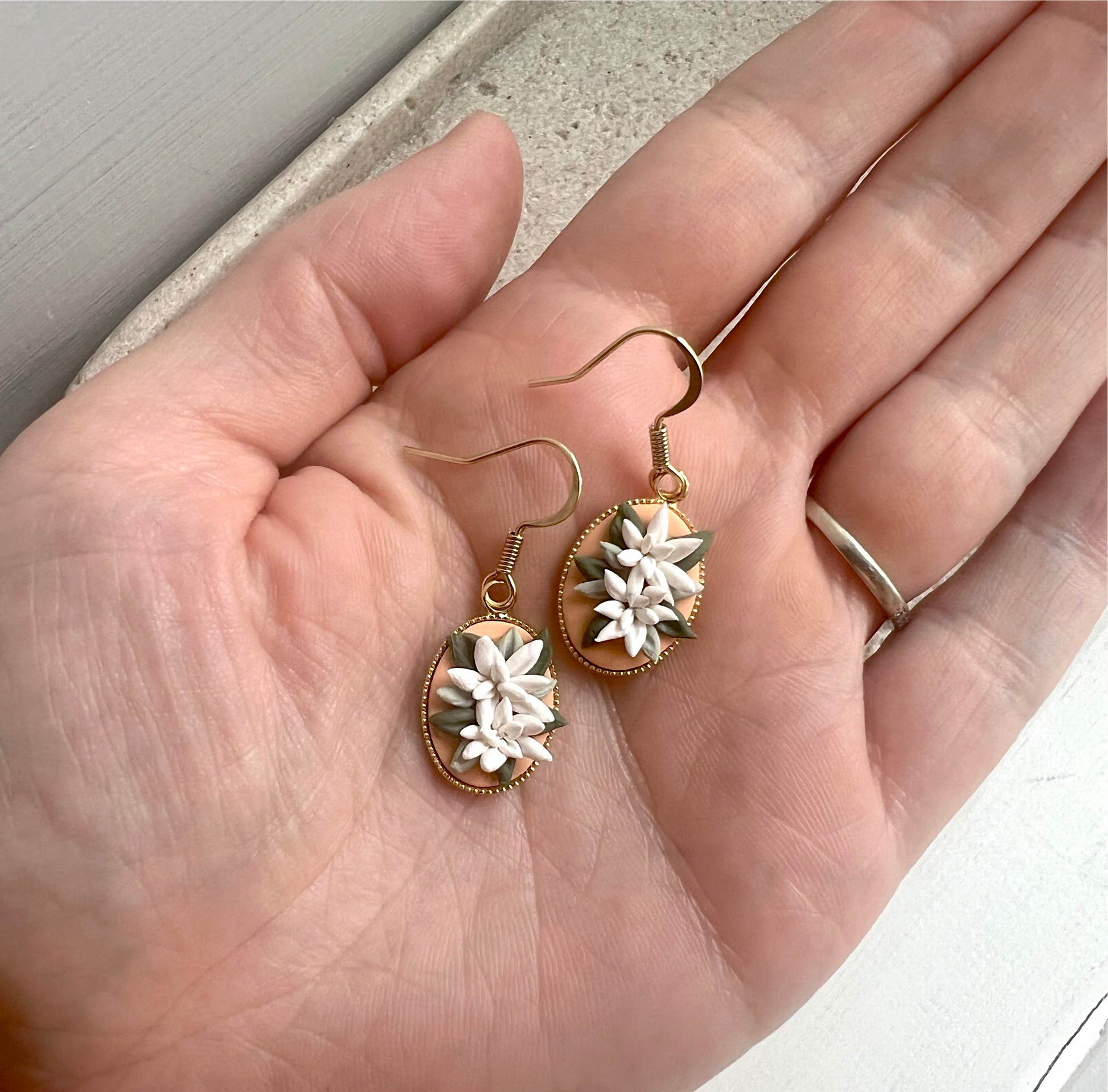 1" gold plated oval frame earrings with peach clay and white dahlia flowers on gold plated hooks. Also available in a necklace to complete the set!
